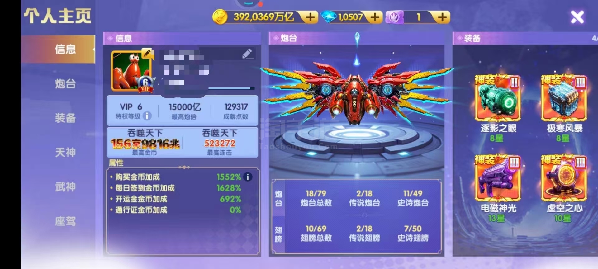 392兆v6 神装套1.5万炮台 天王六星 洪荒三级 西游羁绊 武神连击1200 便宜处理