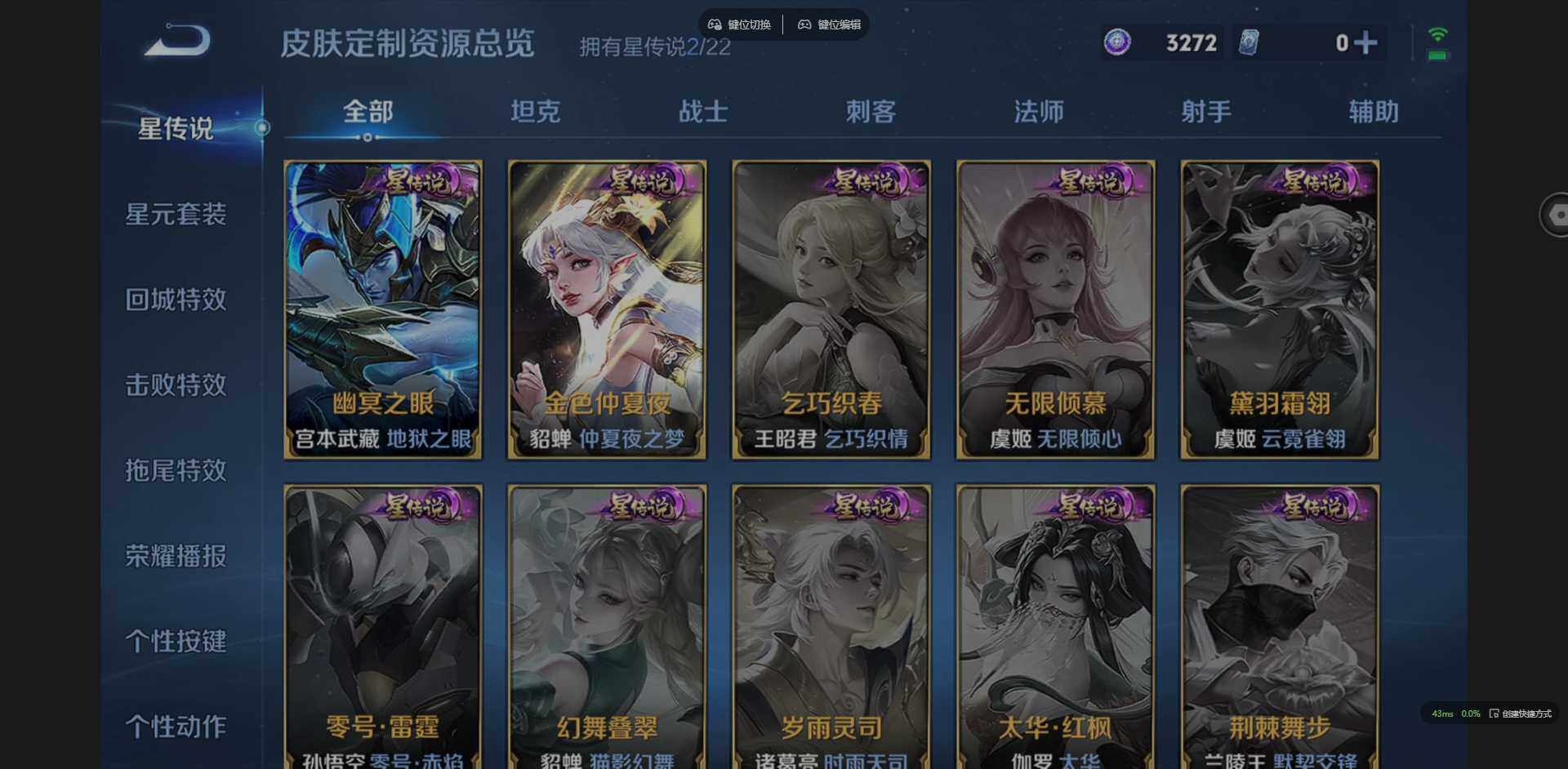 营地账号:477949273/贵族等级: V7 英雄数: 126 皮肤数: 258 荣耀水晶: 全息碎影 星传说: 幽冥之眼,金色仲夏夜 传说皮: 黄金狮子座,黄金射手座,一念神魔,仲夏夜之梦,地狱之眼,无双飞将,神树通天 限定皮: 遇见飞天,李小龙,游园惊梦,梁祝,天魔缭乱,飞衡,天狼征服者,冰霜恋舞曲,逐梦之影,热情桑巴,天狼绘梦者,白虎志,朱雀志,至尊宝,霸王别姬-虞姬,高山流水,五谷丰年