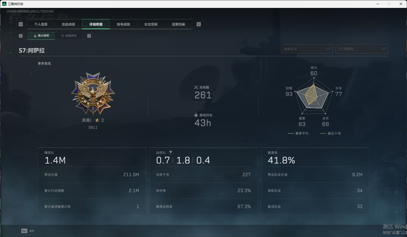 N6382/QQ区/哈夫币18W/总资产358.3M/行动等级60/战场等级50/S7S赛季顶级安全
