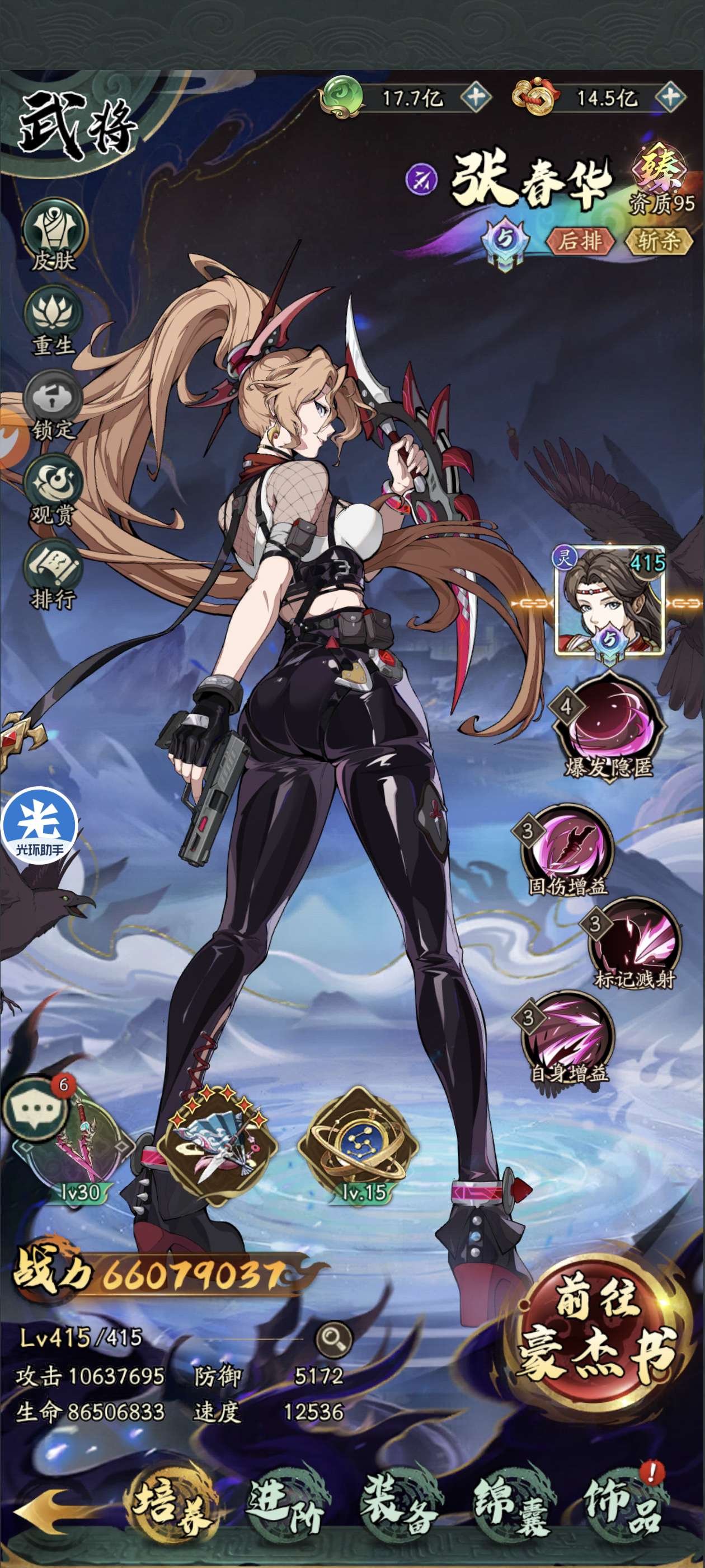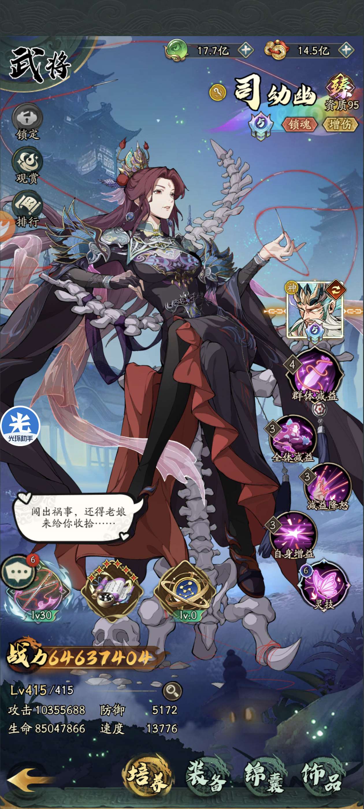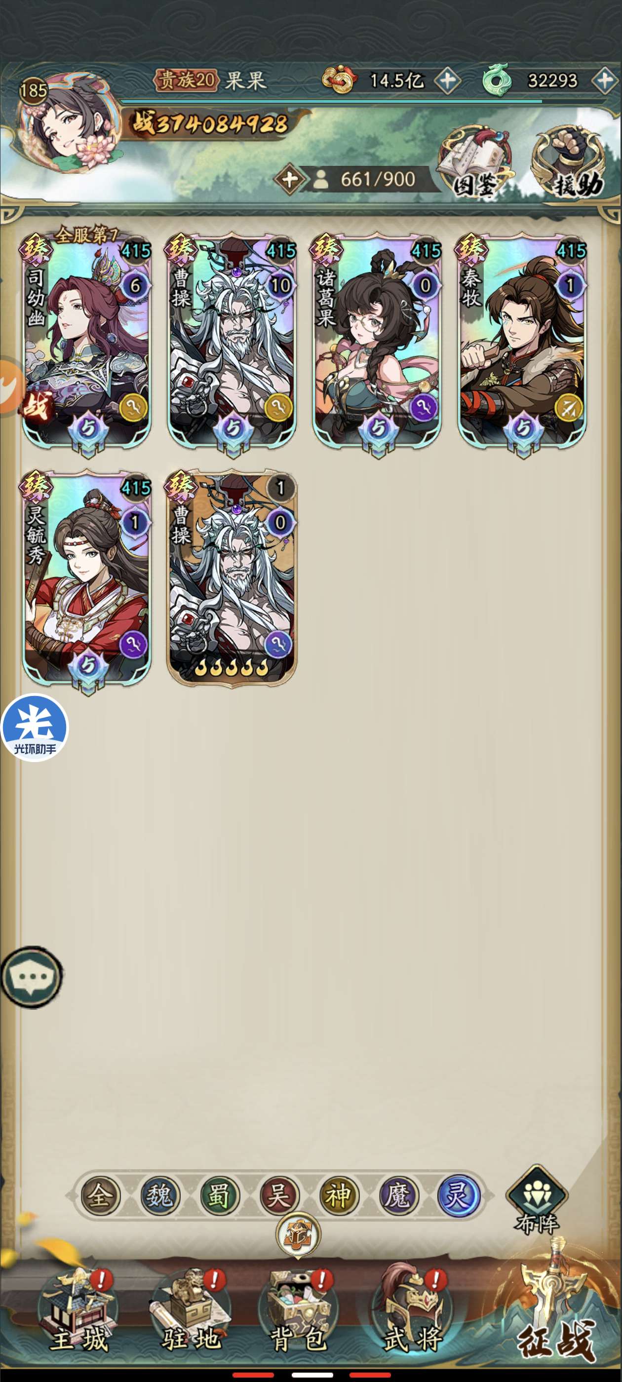 V20灵10曹操,灵6司幼幽,5星极道弑刃,5星御敌满星相柳。3星熊猫