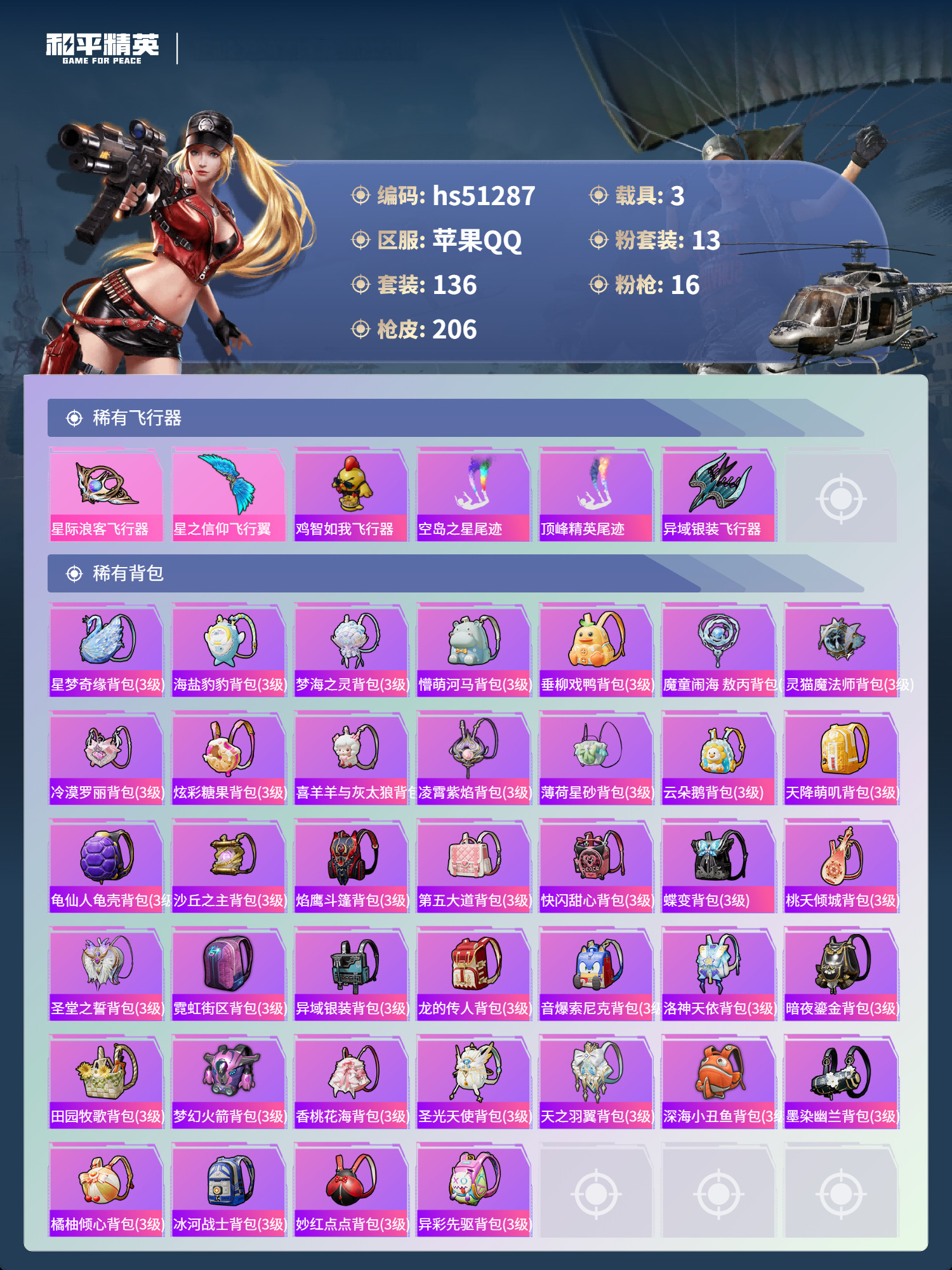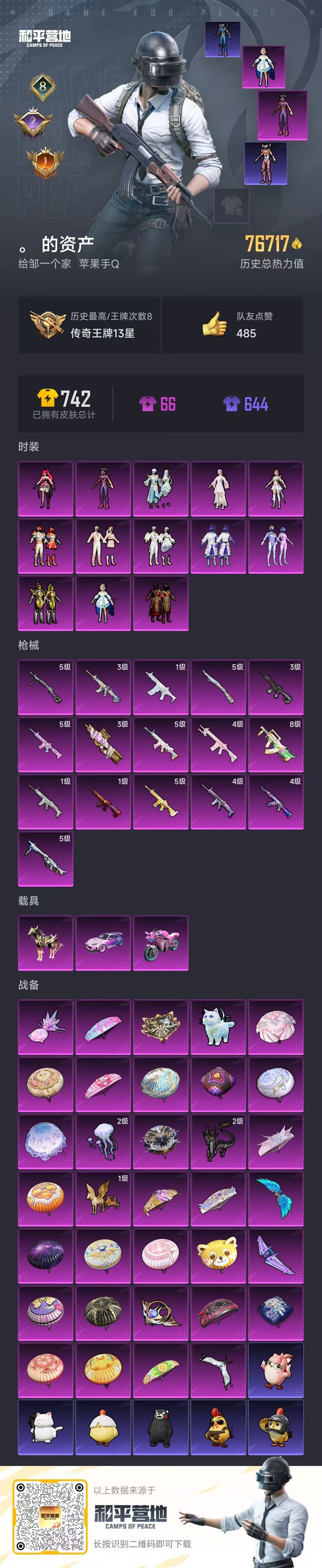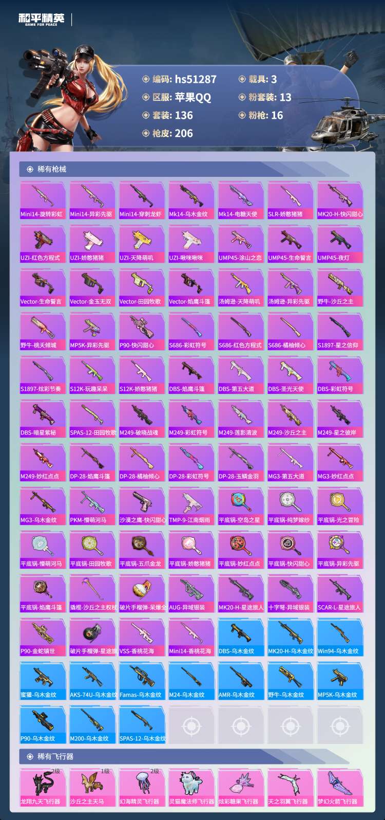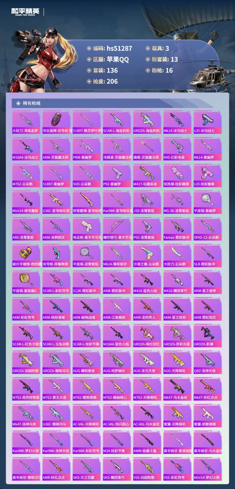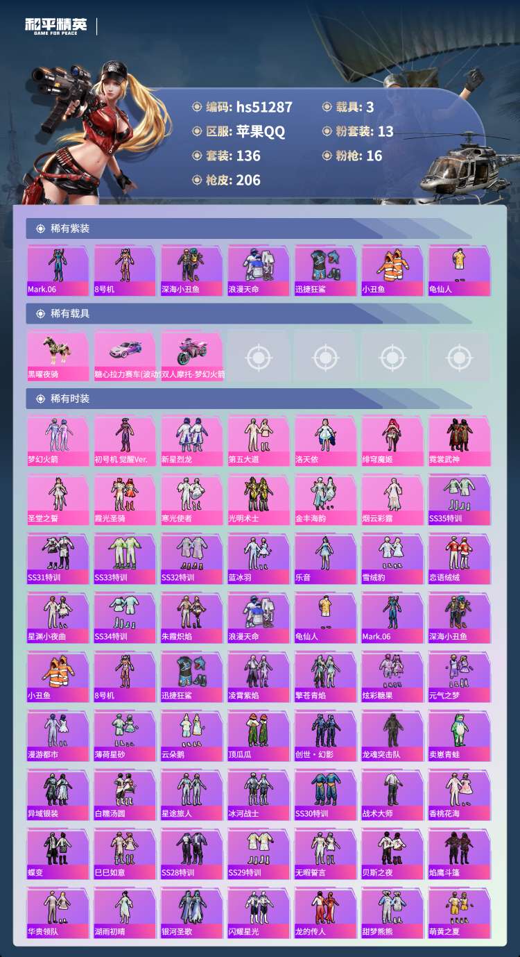 hs51287 苹果手Q-8王牌印记-13粉装-16特效枪-3载具-76717热力值-136套装-2