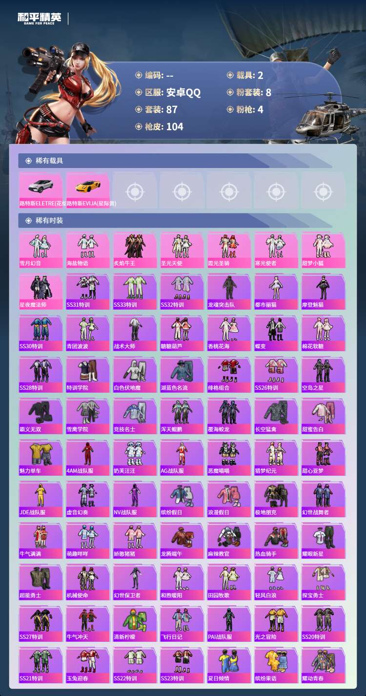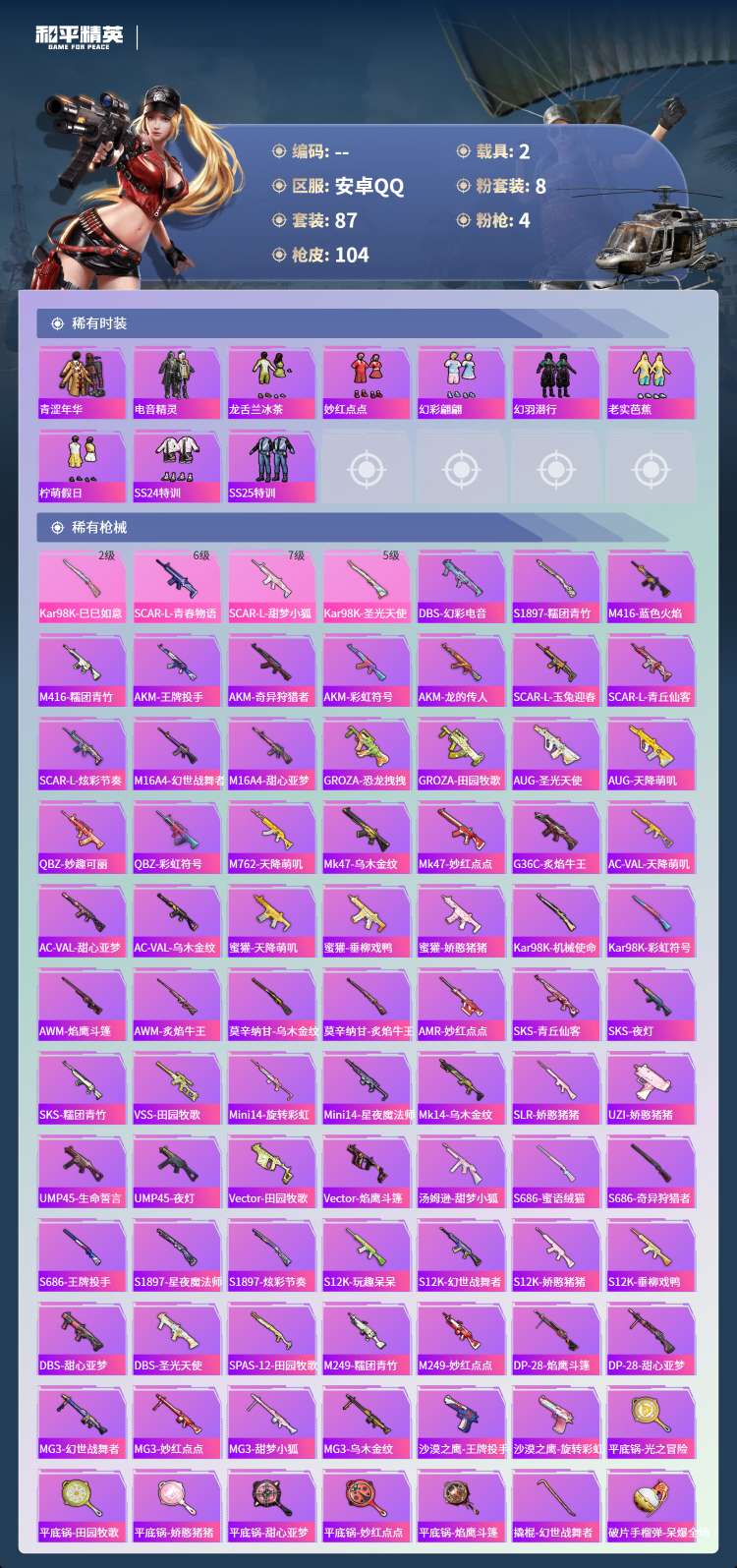 安卓手Q-4王牌印记-8粉装-4特效枪-2载具-42602热力值-87套装-104枪皮【8粉装】套装