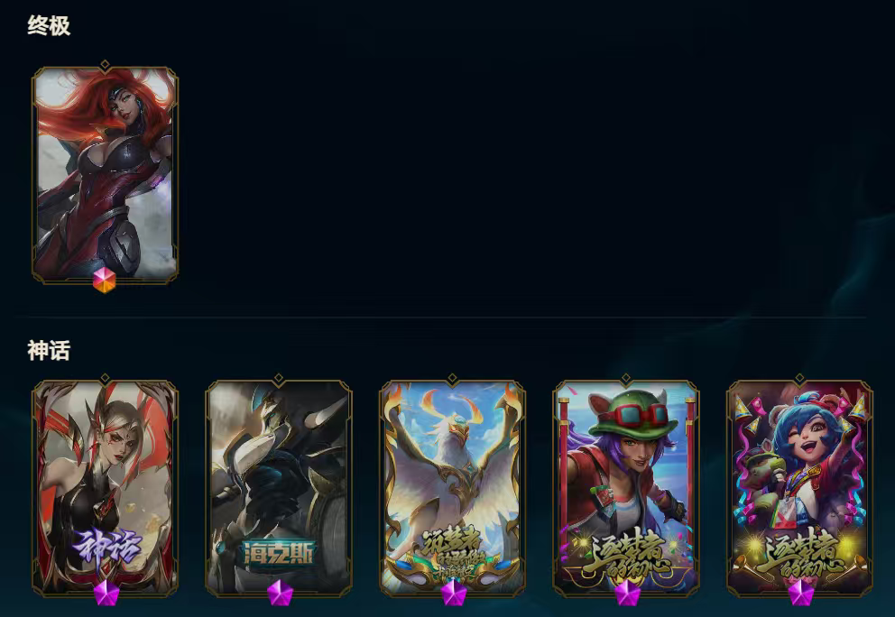 1终极 13神话 11臻彩 42限定 49传说 365皮肤 296炫彩 172英雄
