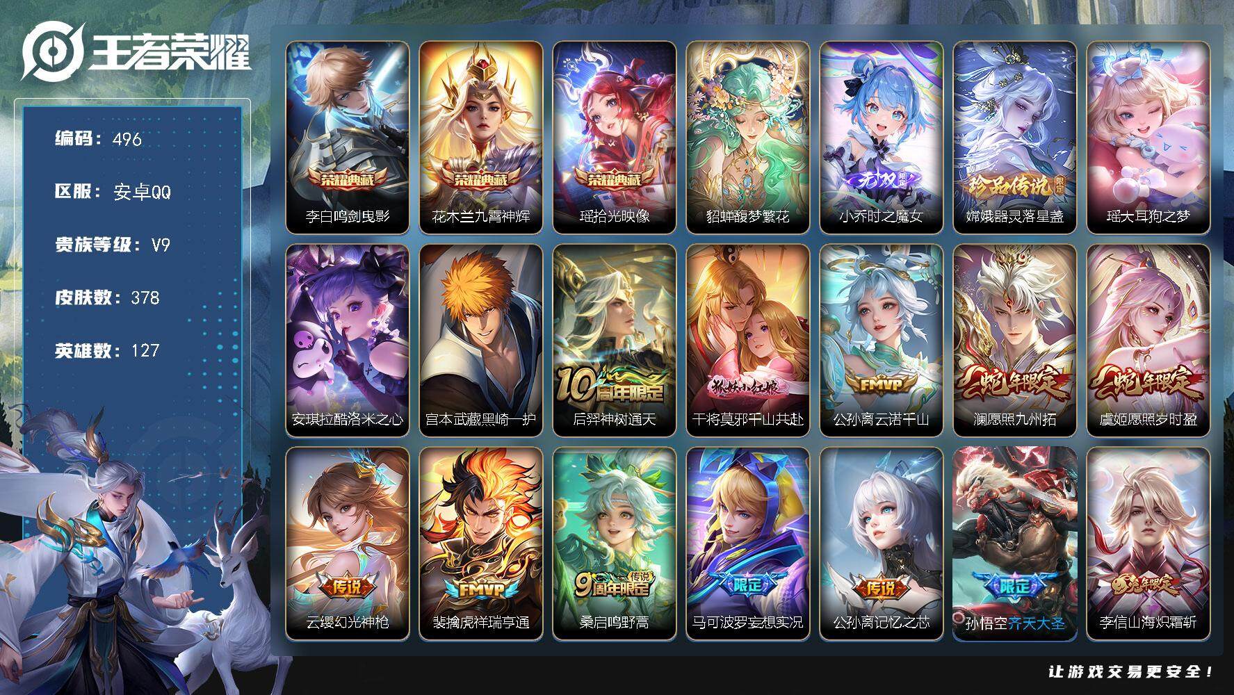 167-[14144809]贵族9星耀3 安卓手Q518区378皮3典藏30传说1无双4珍品传说1珍品无双V9 营地ID437808972至尊星耀II【珍品传说皮肤】:黑崎一护,酷洛米之心,大耳狗之梦,器灵·落星盏【珍品无双皮肤】:馥梦繁花【无双皮肤】:时之魔女【荣耀典藏】:九霄神辉,鸣剑·曳影,拾光映像【优质限定皮肤】:山海·炽霜斩,神威,白虎志,至尊宝【传说皮肤】:神树通天,飞鸢探春,千山共赴,寅虎·赤拳,鸣野蒿,记忆之芯,地狱之眼,妄想实况,仲夏夜之梦,游龙清影,启明星使,山海·炽霜斩,