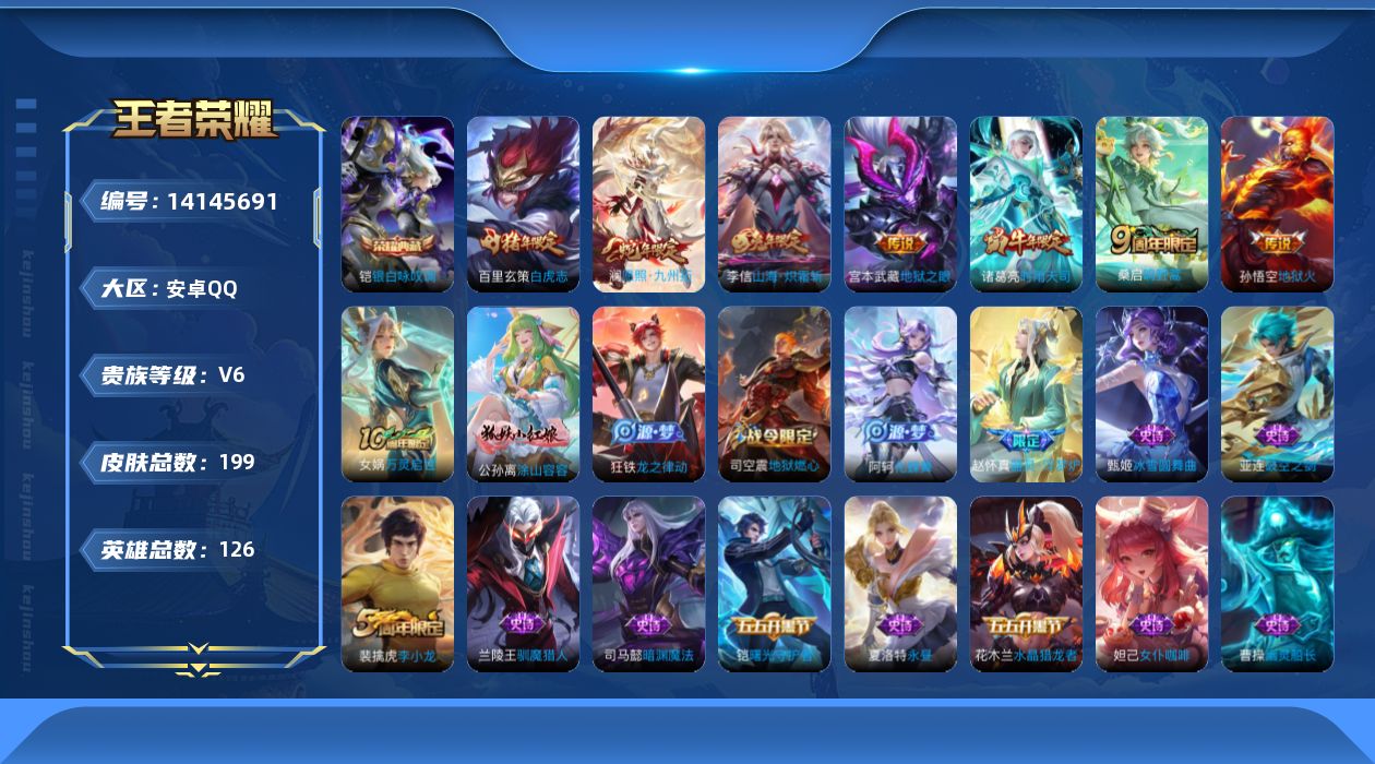 133-[14145691]贵族6-金标百里玄策-改名卡1-水晶0-总皮199-典藏1-传说8-无双0-珍品无双0-珍品传说0 安卓手Q532区 营地ID424306753绝世王者【荣耀典藏】:银白咏叹调【优质限定皮肤】:山海·炽霜斩,白虎志【传说皮肤】:神树通天,地狱之眼,愿照·九州拓,山海·炽霜斩,鸣野蒿,白虎志,时雨天司,地狱火【史诗皮肤】:末日机甲,巫礼祀神,万物之道,万灵启世,猫狗日记,龙之律动,涂山容容,德古拉伯爵,器灵·浮梦炉,原初追逐者,天才门将,星夜王子,舞动绿茵,游园惊梦,水