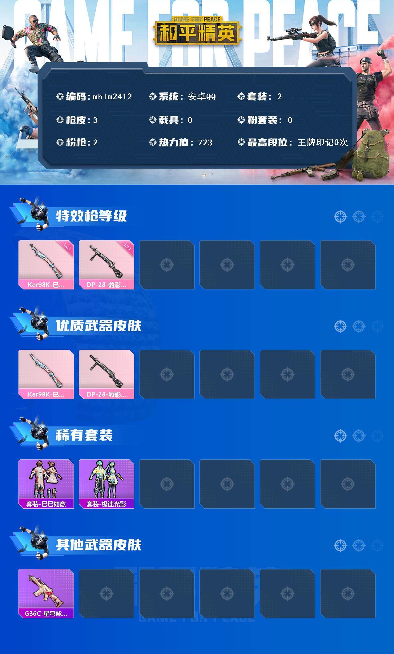 和平精英【安卓QQ】【mhlm2412】安卓 手Q-0粉装-2特效枪-0载具-0粉色飞行器-723