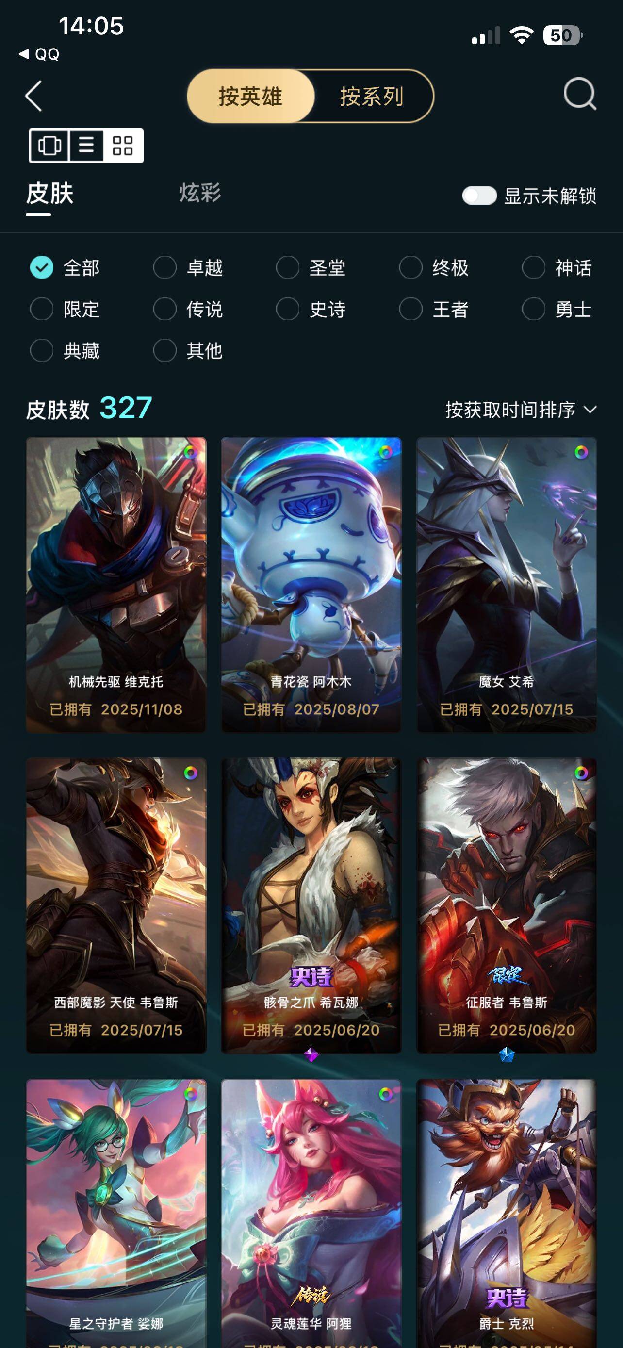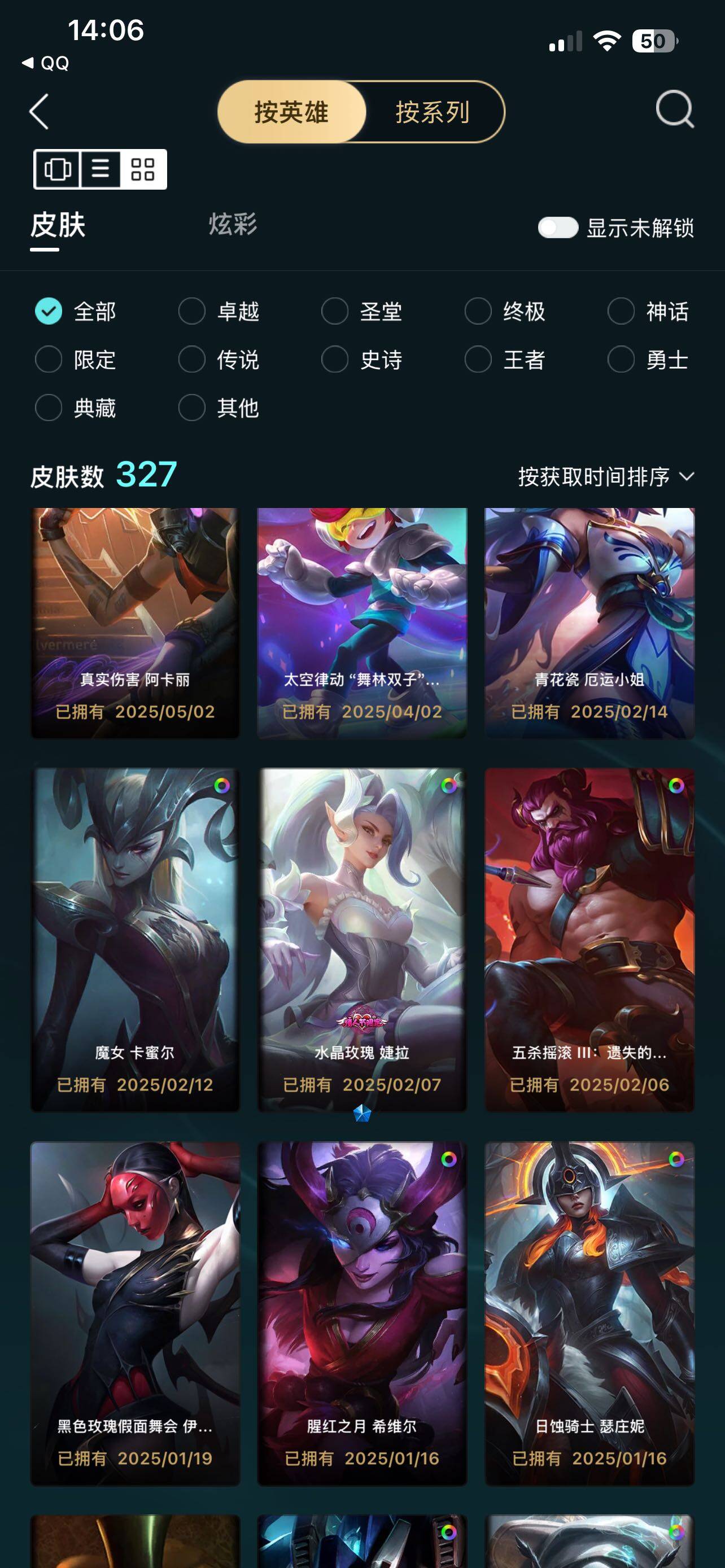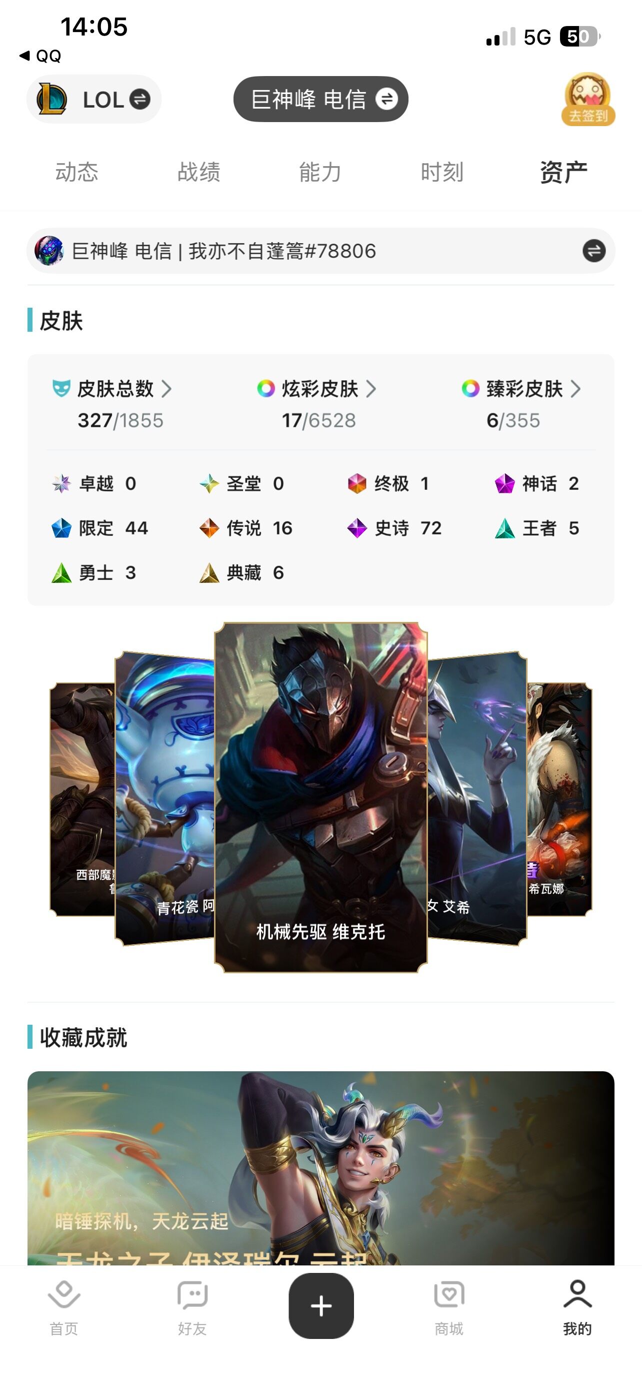 【店主推荐捡漏号!可直接换绑】黑铁段位-172英雄-327皮肤-17炫彩-1终极-2神话-44限定-16传说-72史诗