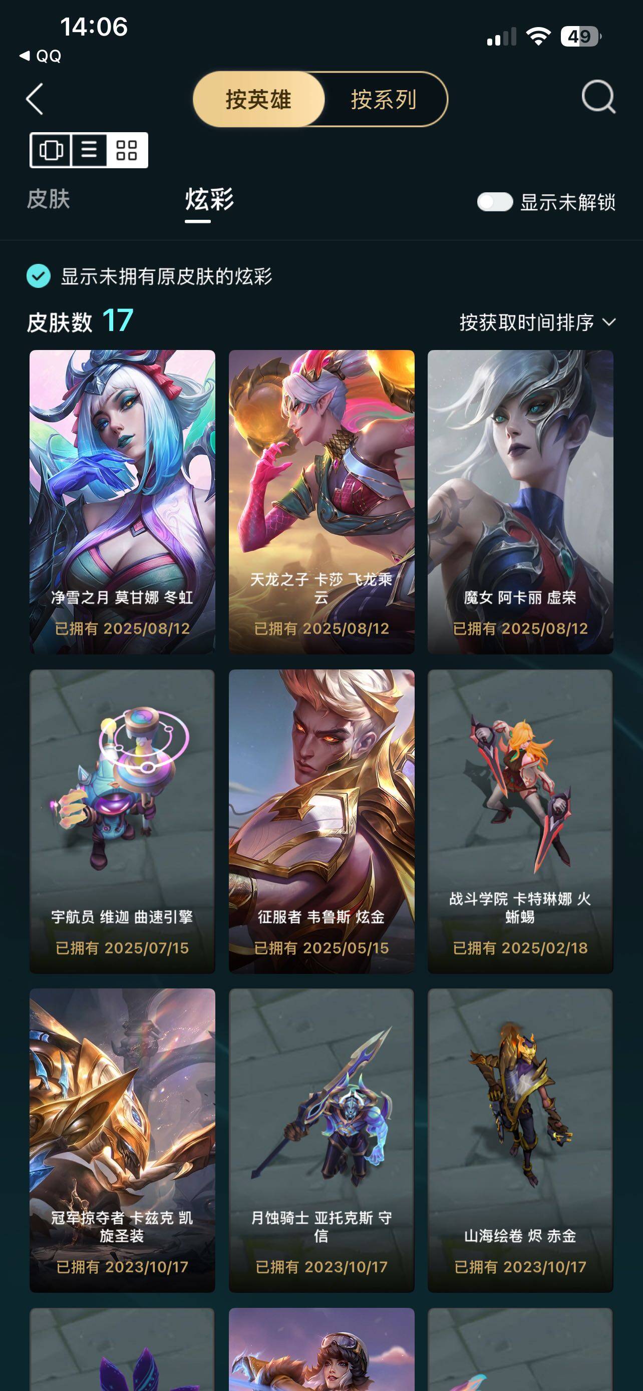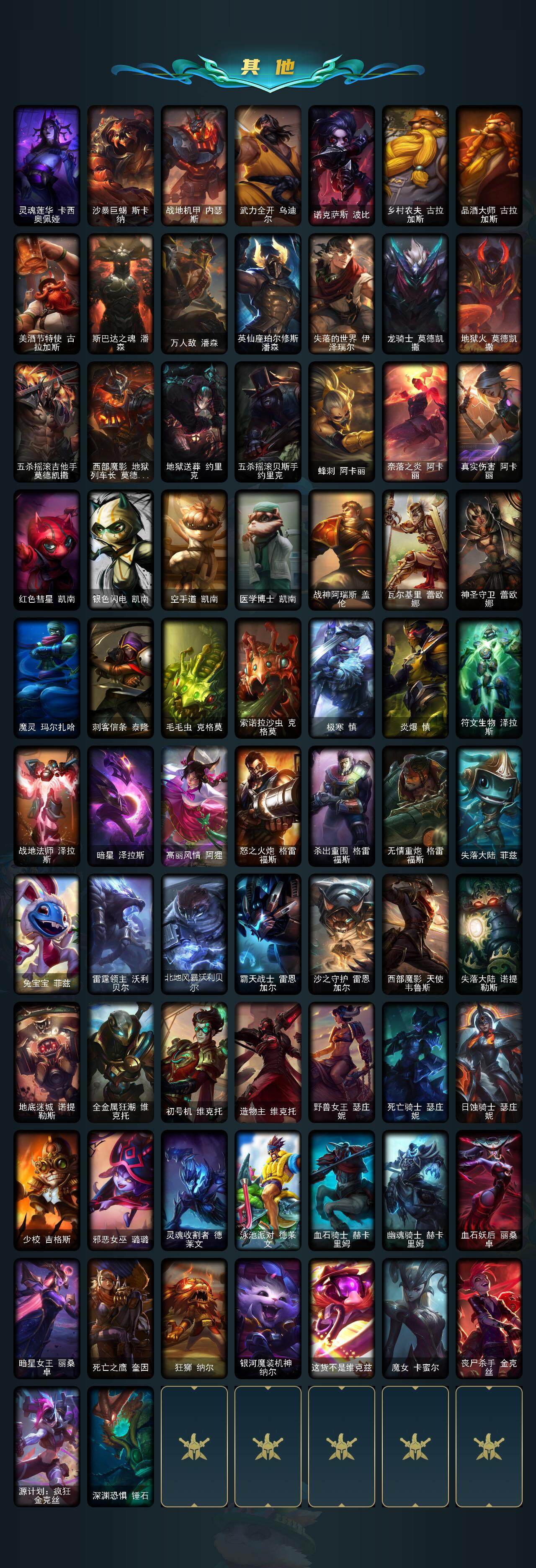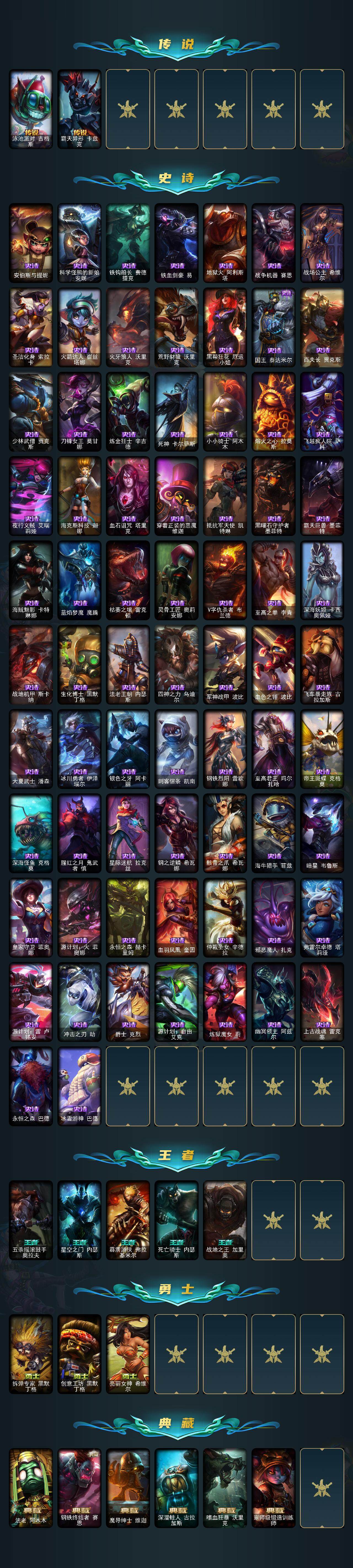 【臻彩皮肤】:天龙之子卡莎飞龙乘云,无畏骑士瑟庄妮赤子初心,征服者韦鲁斯炫金,冠军掠夺者卡兹克凯旋圣装,魔女阿卡丽虚荣,净雪之月莫甘娜冬虹