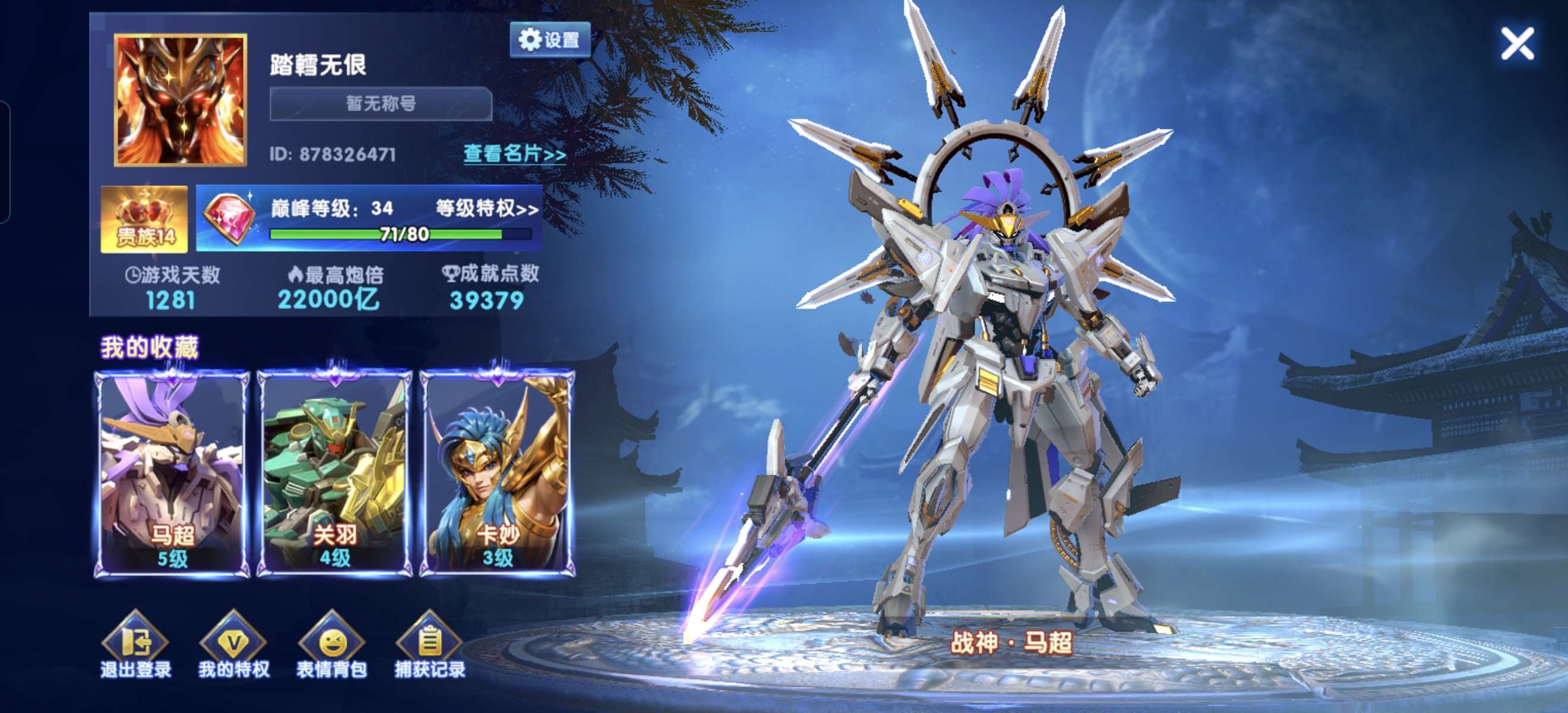 贵族14号,巅峰34,纯救济5000万亿,战神马超、雅典娜、朱雀、白虎、赵云、关羽全都有,