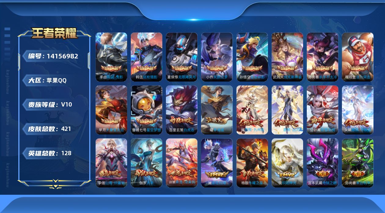 335-[14156982]贵族10 星耀1 贵族积分225785 苹果手Q120区421皮10典藏40传说0无双V10 营地ID525572764至尊星耀I【荣耀典藏】:弑枪猎影,鸣剑·曳影,天鹅之梦,无限飓风号,大秦宣太后,星空梦想,倪克斯神谕,活力突击,杀手不太冷,全息碎影【优质限定皮肤】:无双飞将,祈雪灵祝,山海·炽霜斩,白虎志,神威,至尊宝【传说皮肤】:神树通天,愿照·千秋盛,绯月行,愿照·山河定,愿照·九州拓,幻光神枪,祥瑞亨通,玄雷天君,乘龙·铭钟鼎,乘龙·淬吴钩,炽阳神