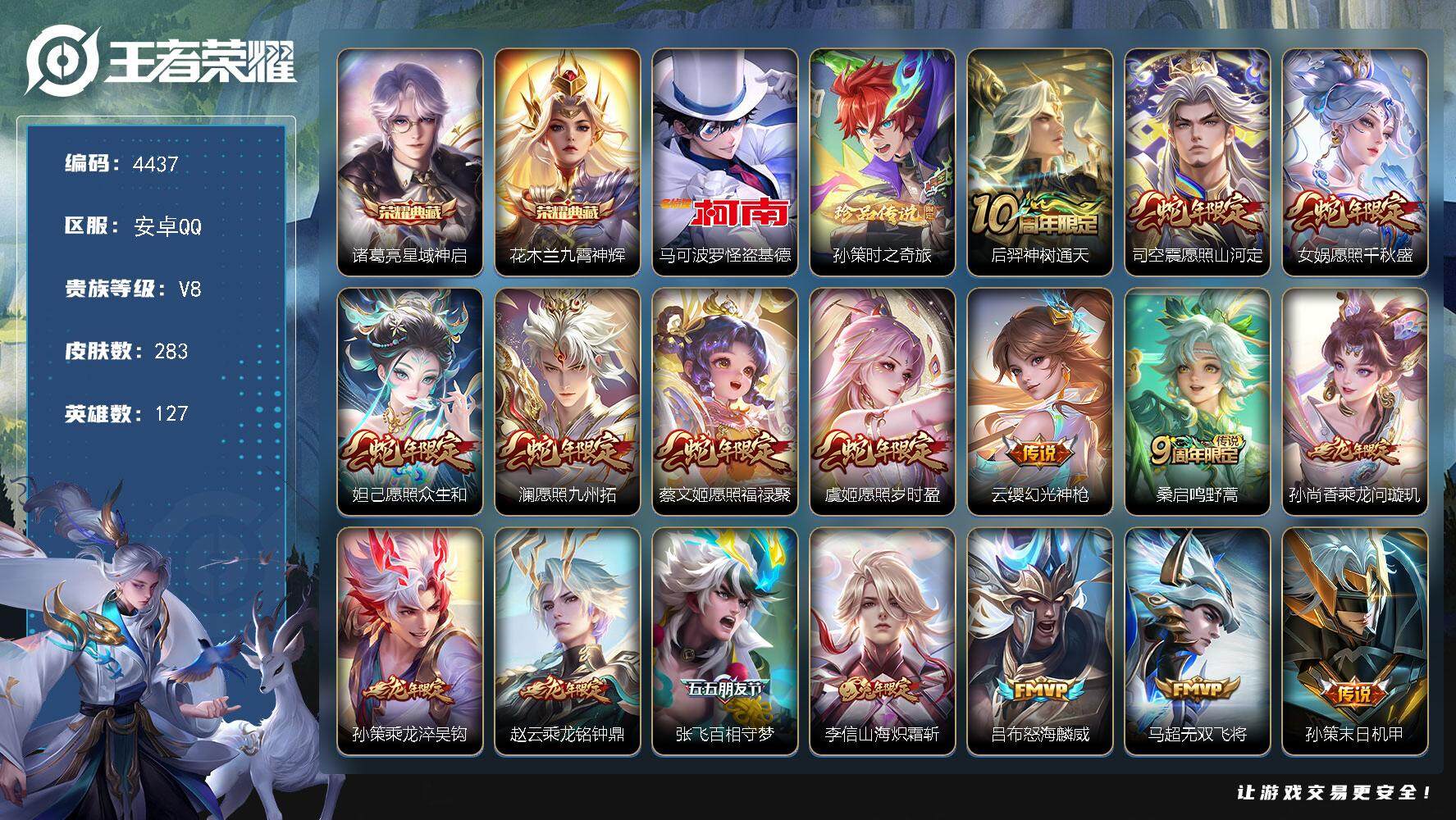 246-[14157831]可二次 贵族8 王者23星 贵族积分73652 财神纳福天幕 安卓手Q213区283皮2典藏31传说0无双2珍品传说V8 营地ID406821727无双王者【珍品传说皮肤】:时之奇旅,怪盗基德【荣耀典藏】:星域神启,九霄神辉【优质限定皮肤】:武圣,无双飞将,山海·炽霜斩【传说皮肤】:神树通天,地狱火,冠军飞将,幻光神枪,黄金白羊座,仲夏夜之梦,愿照·福禄聚,愿照·岁时盈,愿照·山河定,地狱之眼,愿照·众生和,愿照·千秋盛,百相守梦,启明星使,愿照·九州拓,久胜战神,末