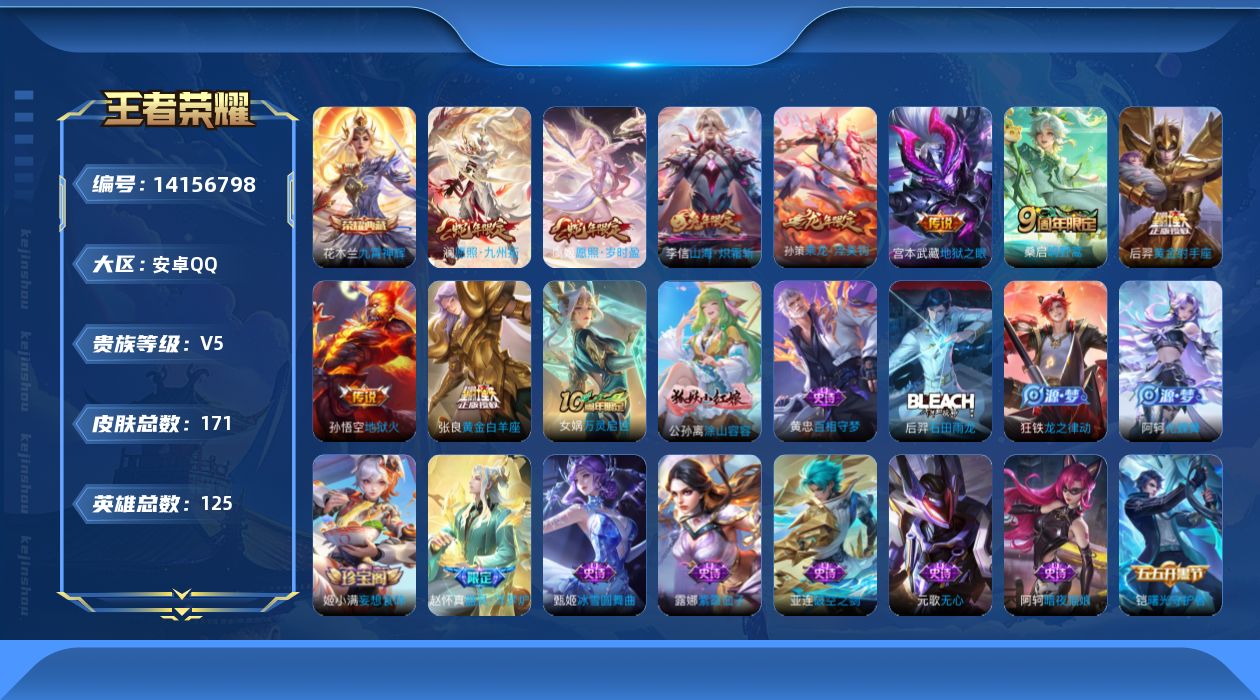615-[14156798]贵族5 王者10星 安卓手Q69区171皮1典藏10传说0无双V5 营地ID1701399031非凡王者【荣耀典藏】:九霄神辉【优质限定皮肤】:山海·炽霜斩【传说皮肤】:神树通天,地狱之眼,地狱火,愿照·岁时盈,愿照·九州拓,鸣野蒿,乘龙·淬吴钩,黄金白羊座,黄金射手座,山海·炽霜斩【史诗皮肤】:地狱岩魂,巫礼祀神,万灵启世,涂山容容,心灵战警,百相守梦,石田雨龙,龙之律动,星界战将,化蝶舞,圣诞狂欢,偶像歌手,器灵·浮梦炉,皇家上将,妄想食味,苍穹之光,水