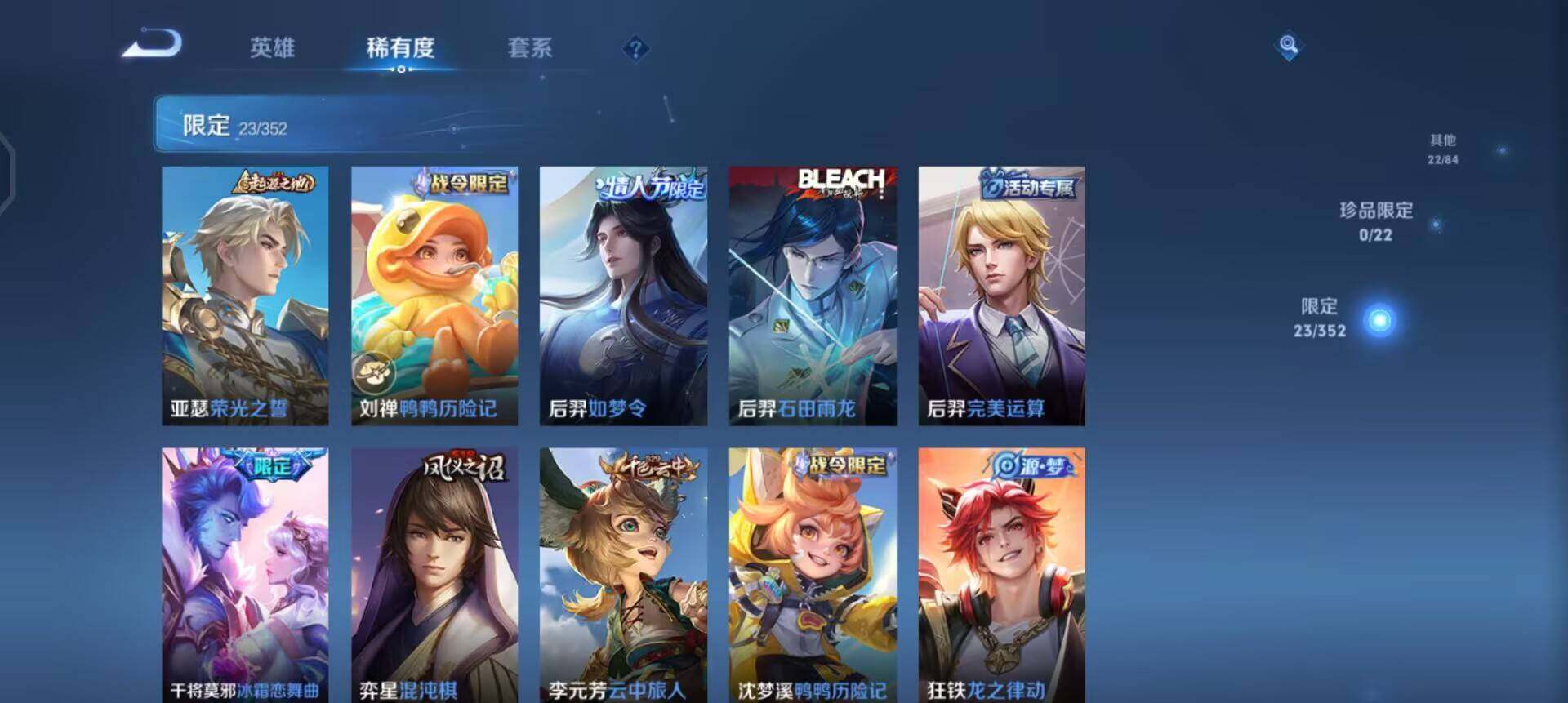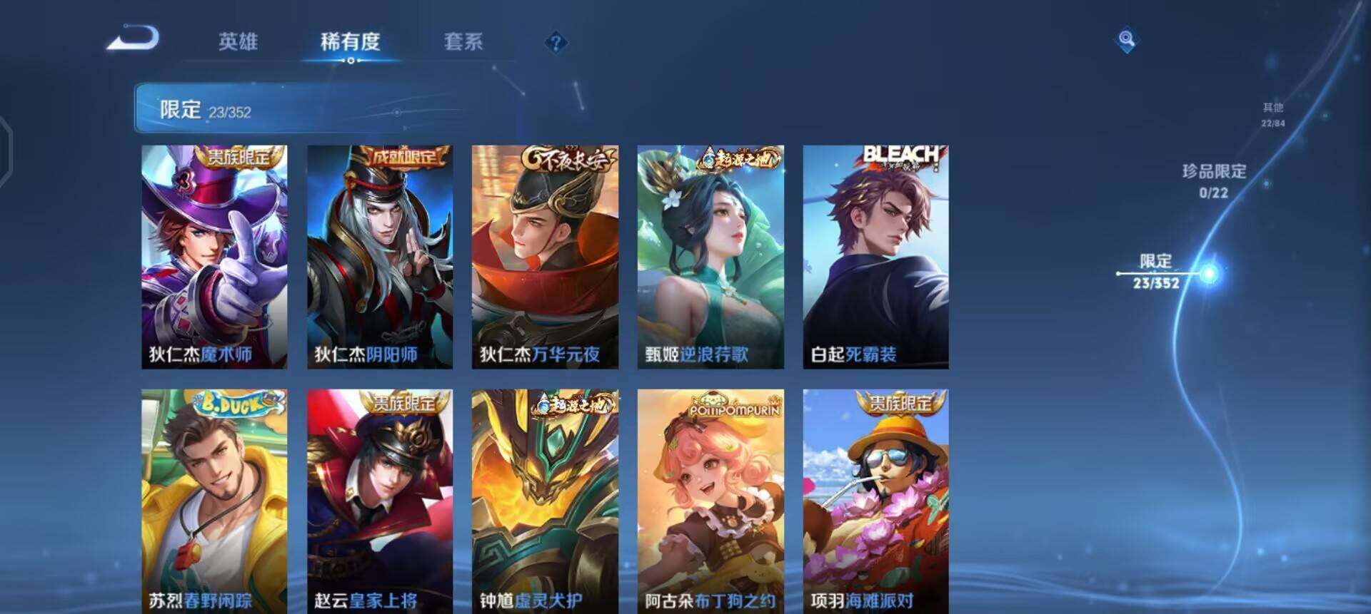 【限定皮肤】:狄仁杰阴阳师,赵云皇家上将,狄仁杰魔术师,狄仁杰万华元夜,项羽海滩派对,后