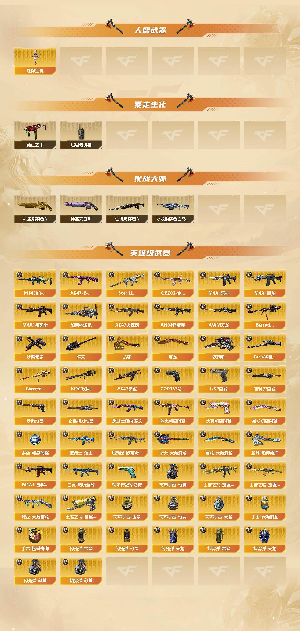 【热门武器】:传说破晓,QBZ03-金色蔷薇*2,M14EBR-玄武,Scar Light-白虎,M200-幻神*2,死亡之眼,白虎-电玩蓝兔,柯尔特-冠军之特,Kar98K-星神,M4A1-黑骑士*2,加特林-炼狱,斯泰尔-蝴蝶,USP-雷暴,COP 357-幻灵,沙鹰-修罗*2,Knife-冠军之刃*2,高爆手雷-幻兽