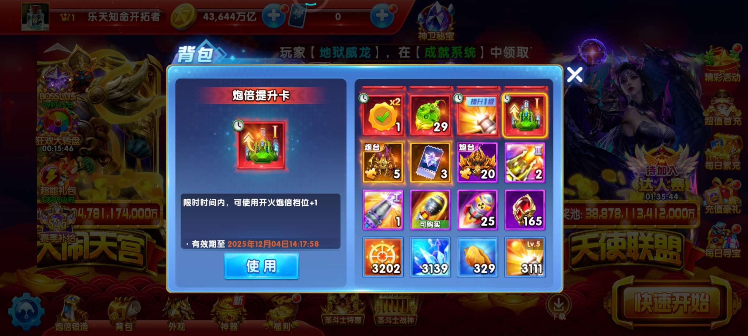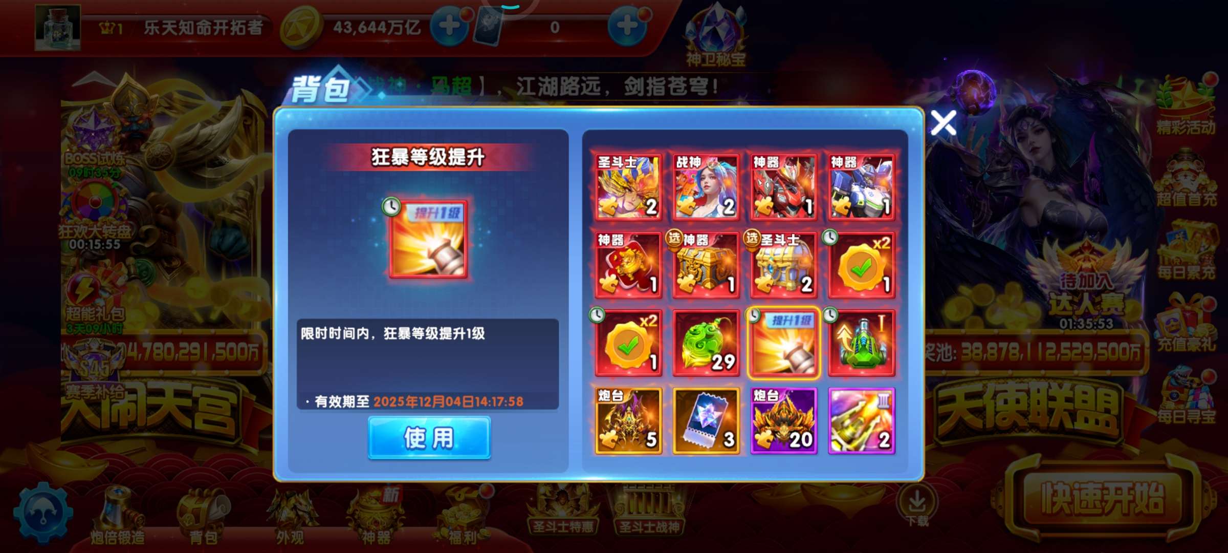 436万亿 实60炮 虚70炮3天 吕布2天 超能2天 巅峰10级 加速翅膀4天 5级狂2天