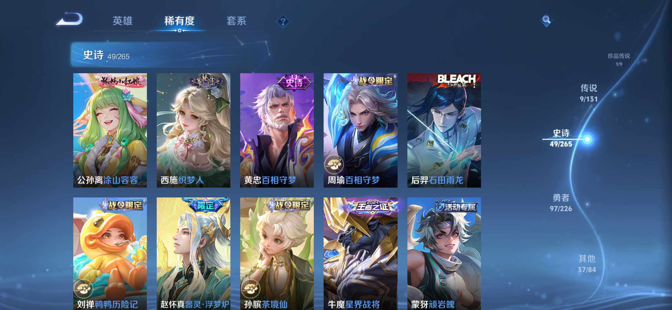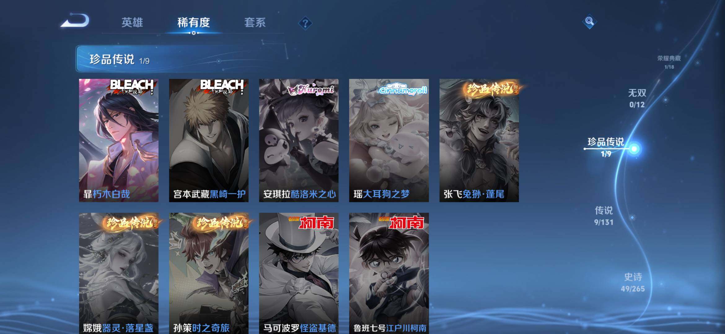 【194皮1典藏9传说1珍品41天幕黑崎一护天幕 弑枪猎影 愿照九州拓 愿照岁时盈 云鹰飞将 】安卓Q-V7-最强王者段位-126英雄-194皮肤-1典藏皮肤-1珍品传说-9传说-49史诗