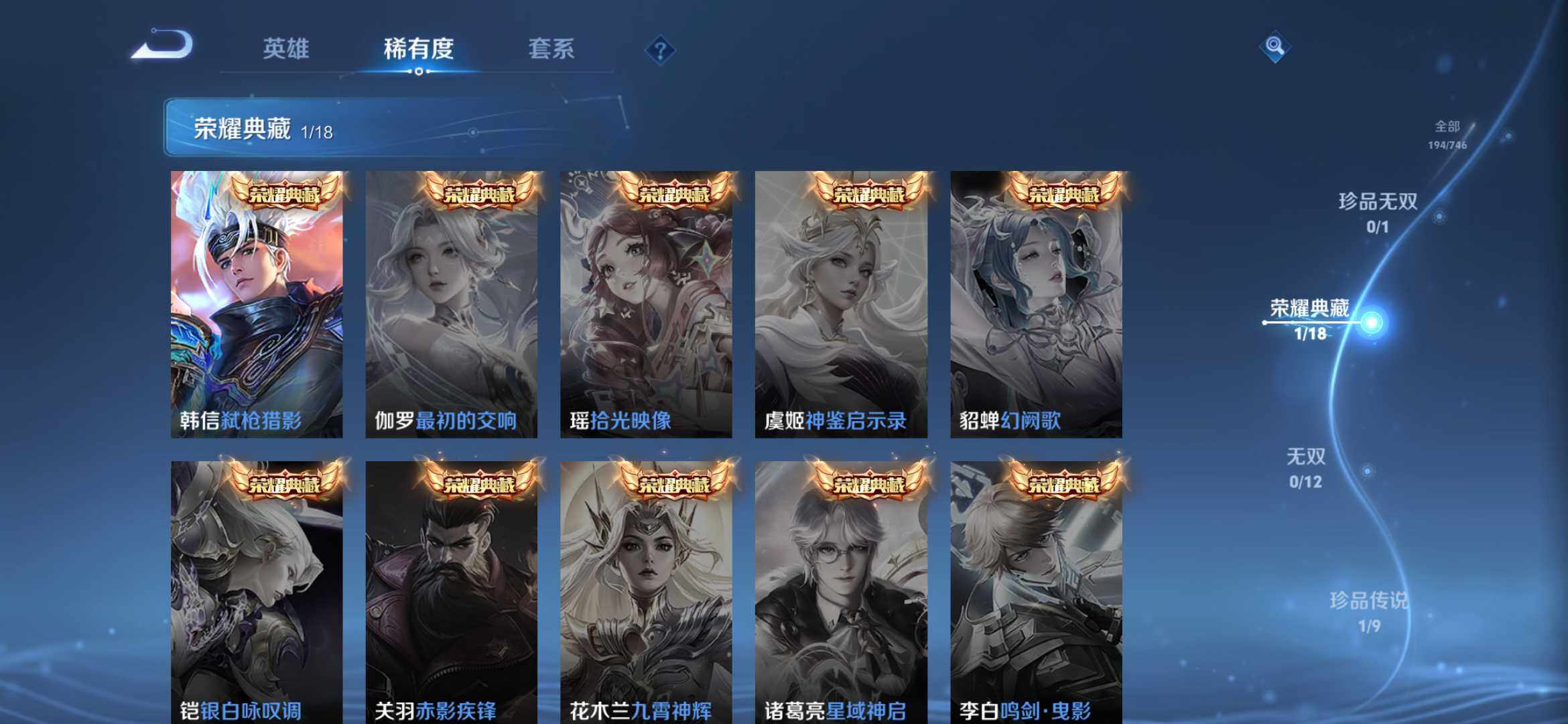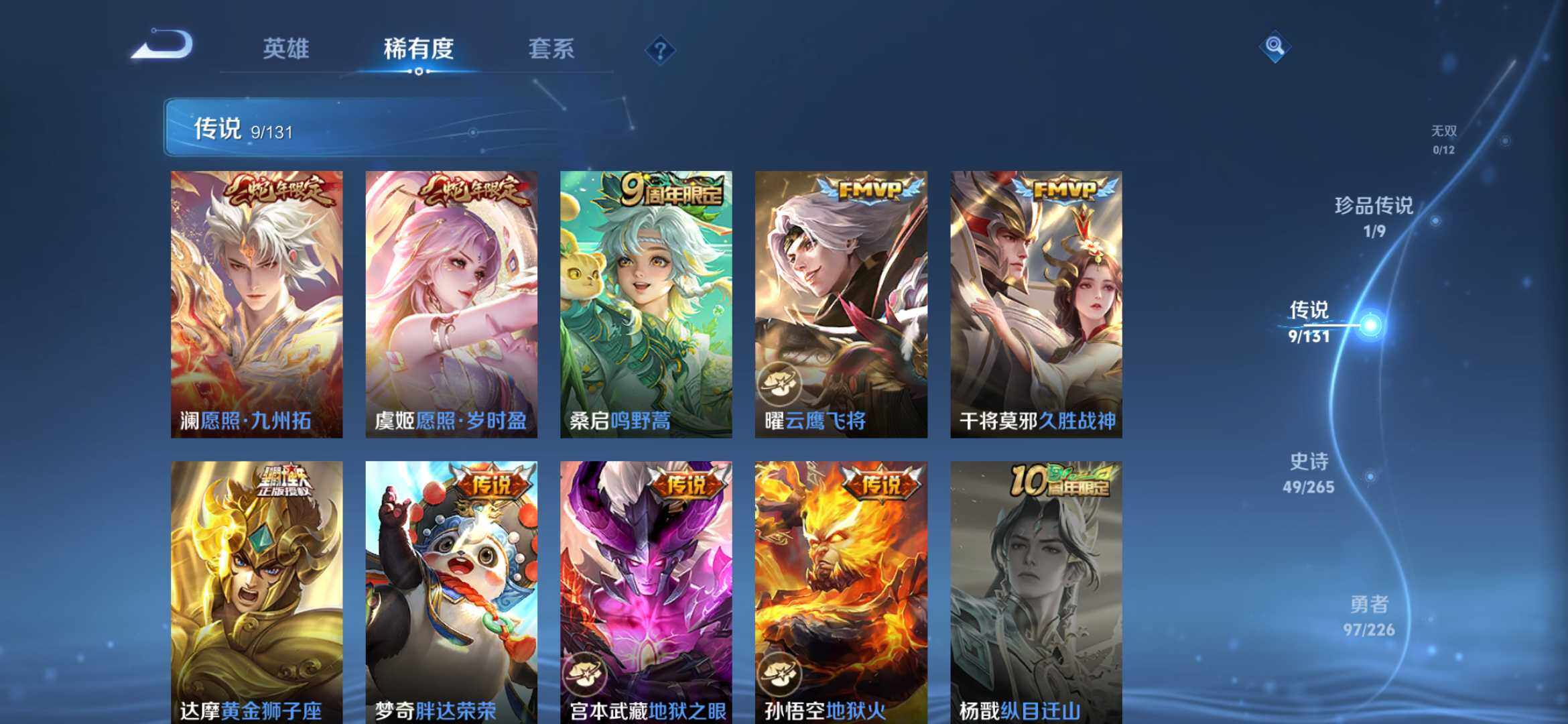 【传说皮肤】:澜愿照九州拓,虞姬愿照岁时盈,桑启鸣野蒿,曜云鹰飞将,干将莫邪久胜战神,达摩黄金狮子