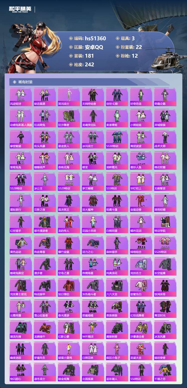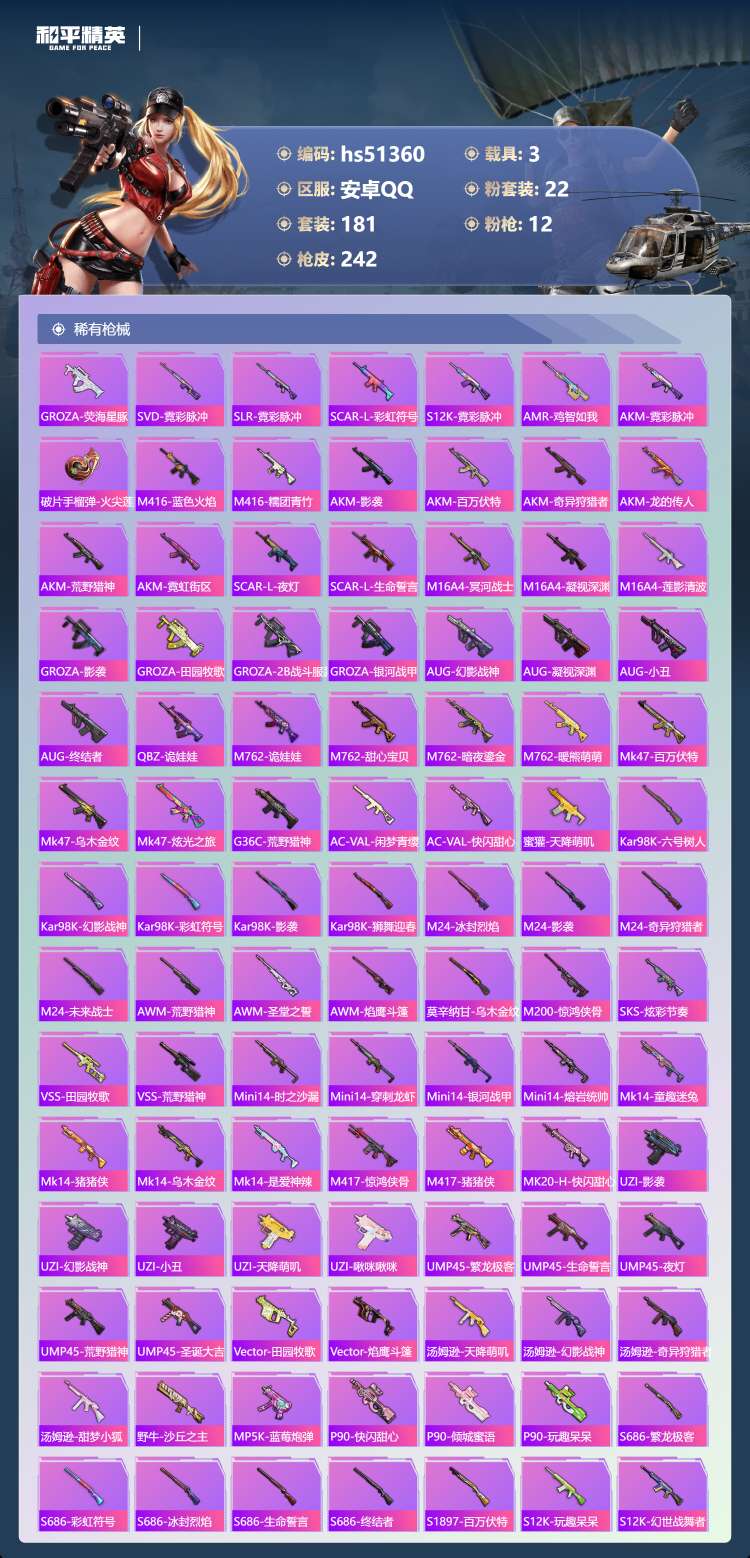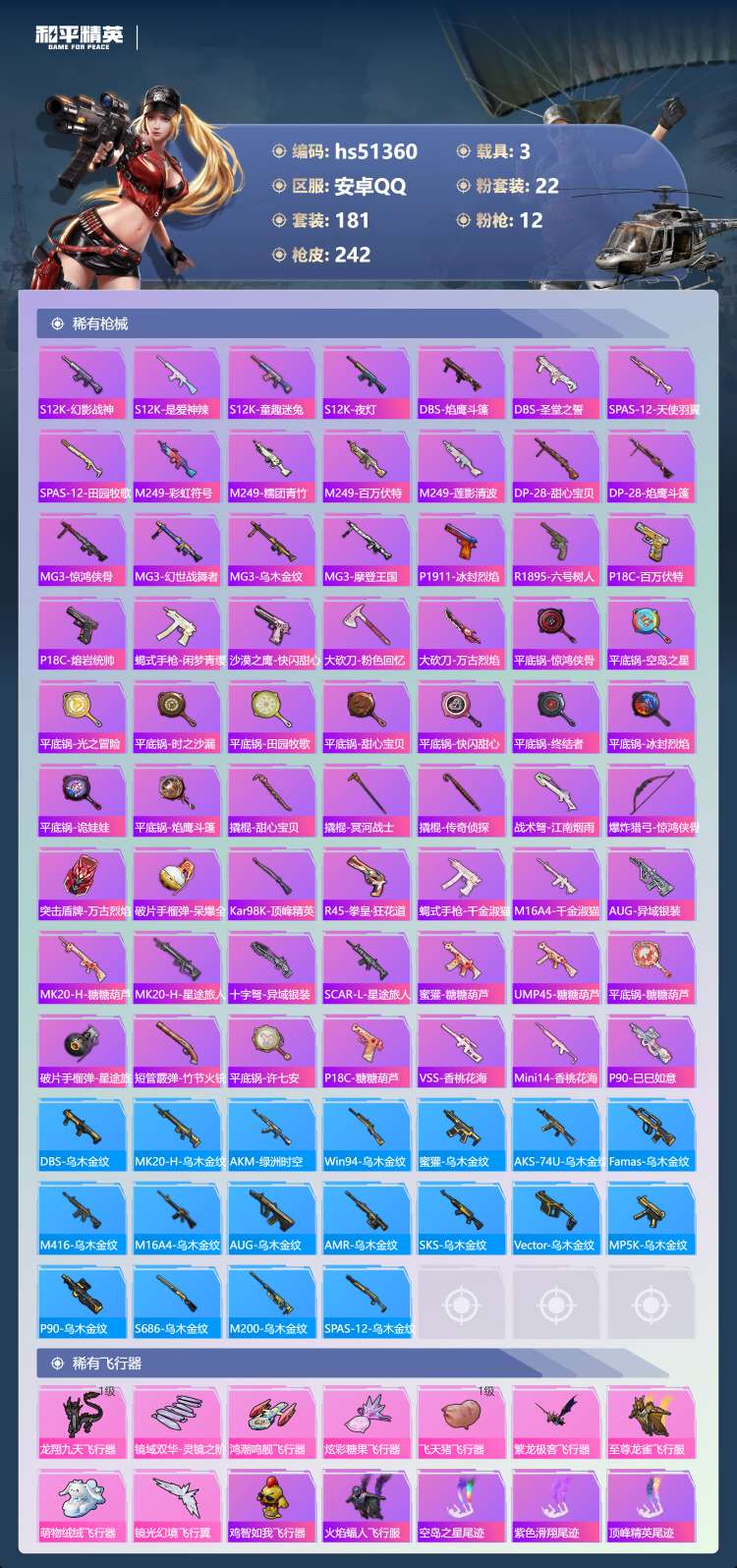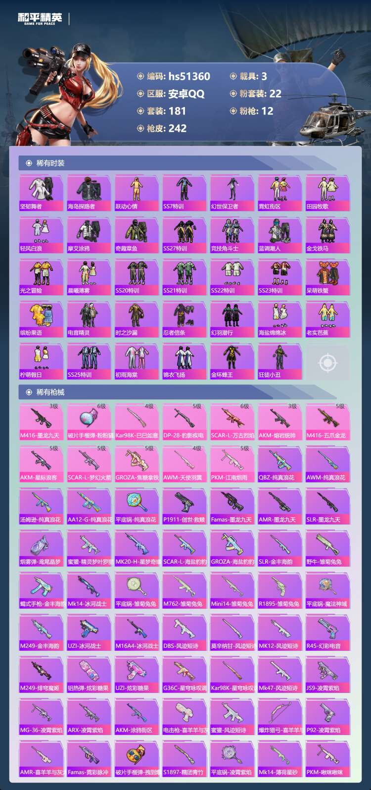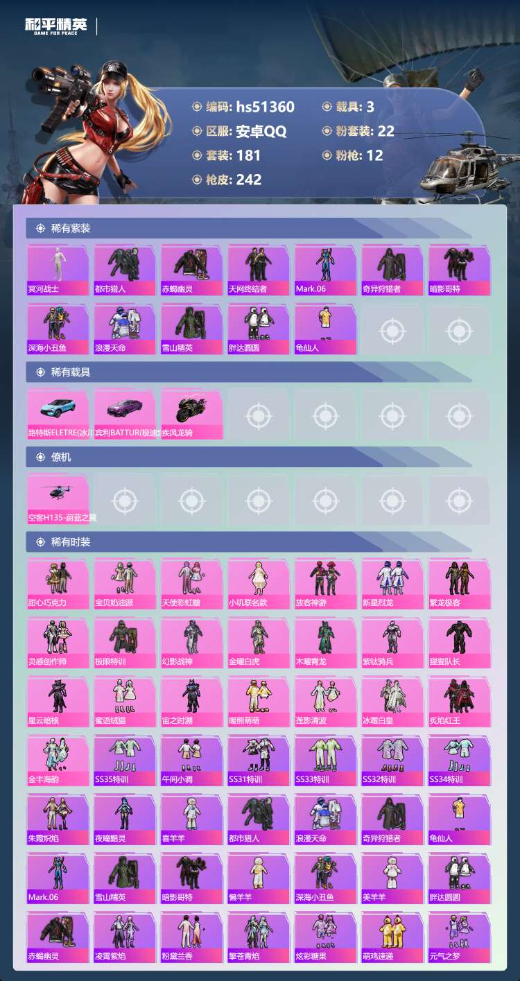 hs51360 安卓手Q-12王牌印记-22粉装-12特效枪-3载具-95354热力值-181套装-
