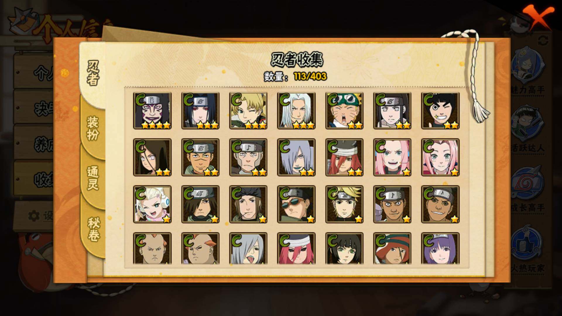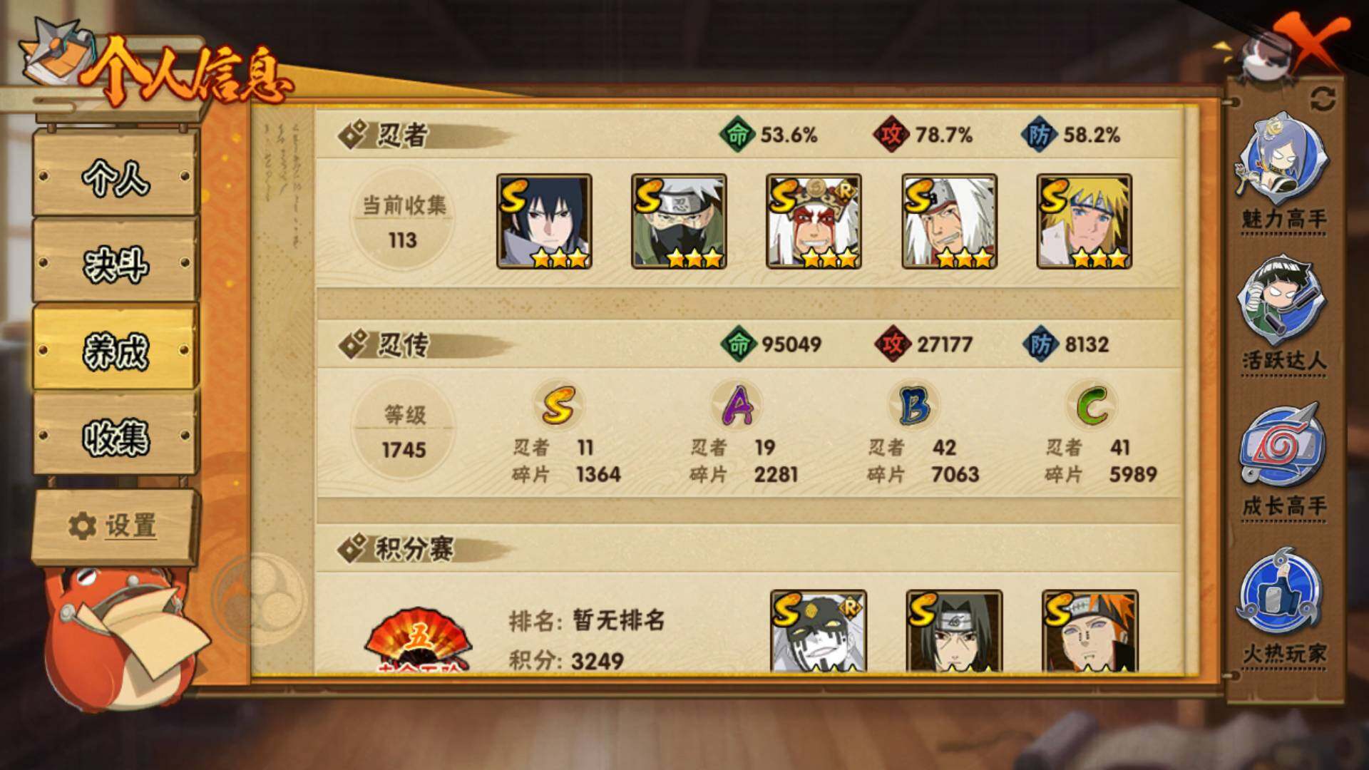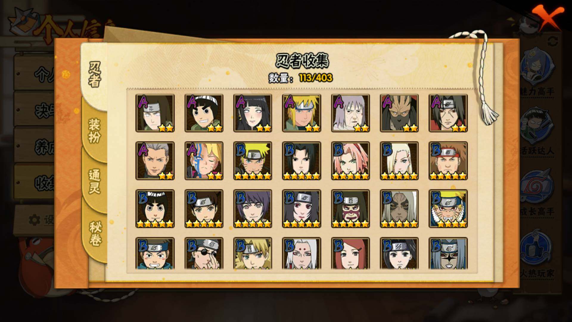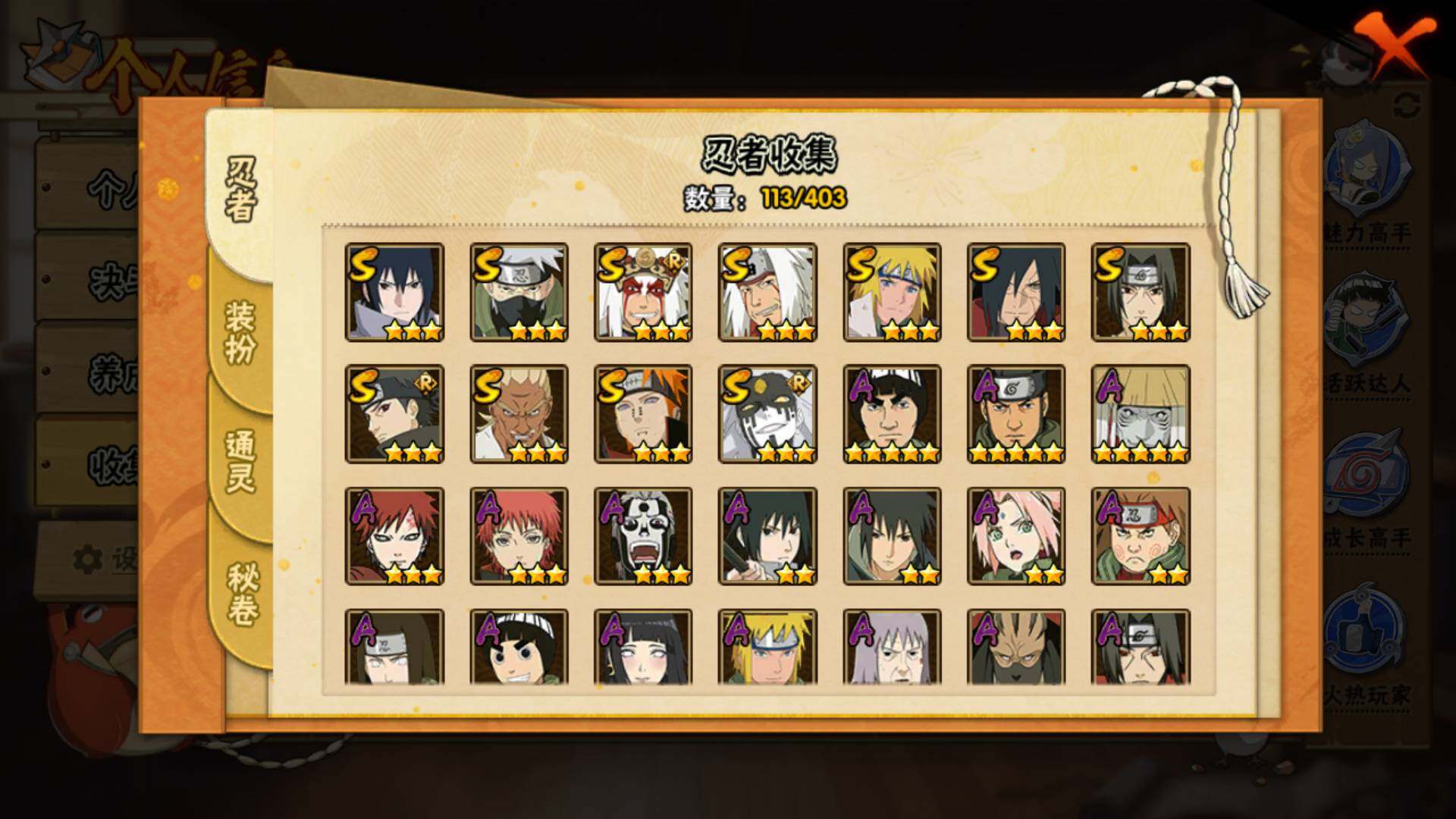 【S级忍者】:宇智波斑「秽土转生·解」(3星),艾「忍界大战」(3星),宇智波鼬「须佐能乎」(3星),宇智波止水「须佐能乎」(3星),旗木卡卡西「须佐能乎」(3星),自来也「舞之豪杰」(3星),自来也「传说中的三忍」(3星),波风水门(3星),佩恩「天道」(3星),宇智波佐助「永恒万花筒」(3星),大筒木桃式(3星)