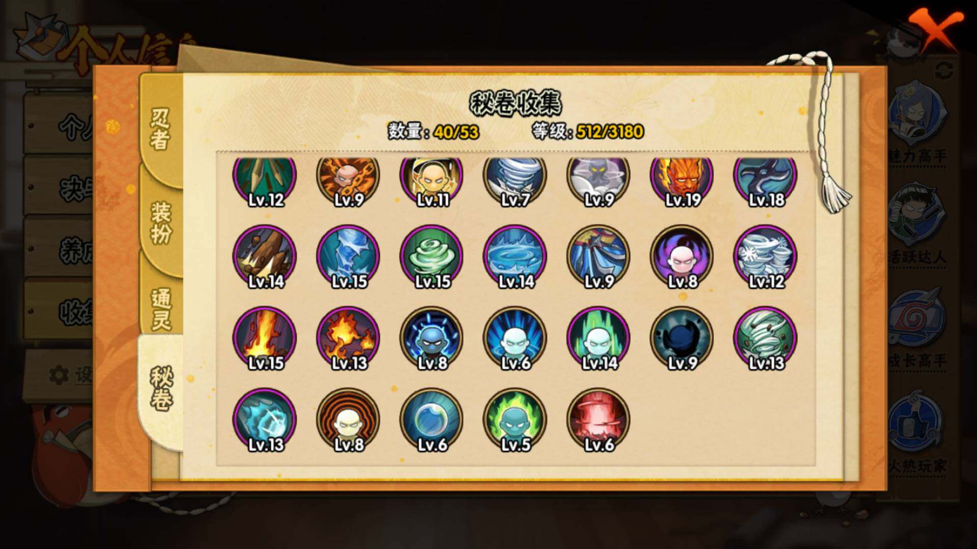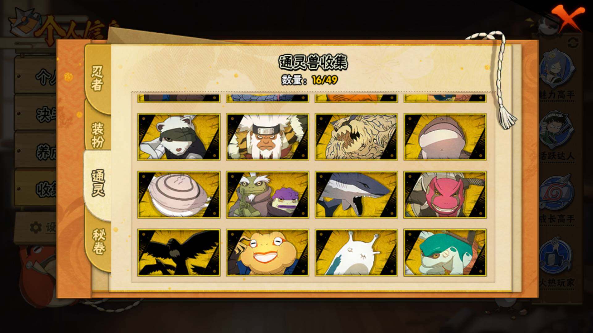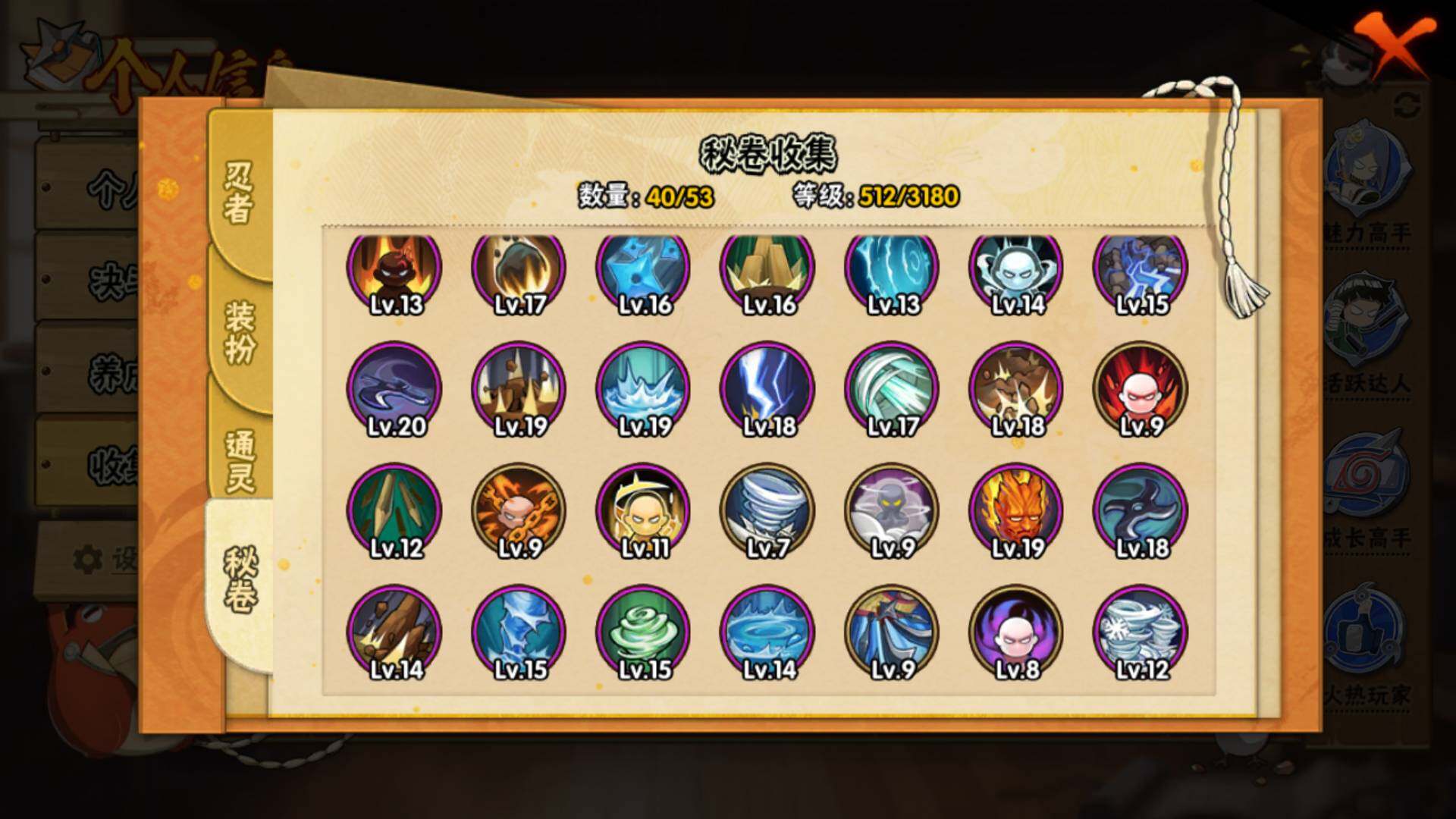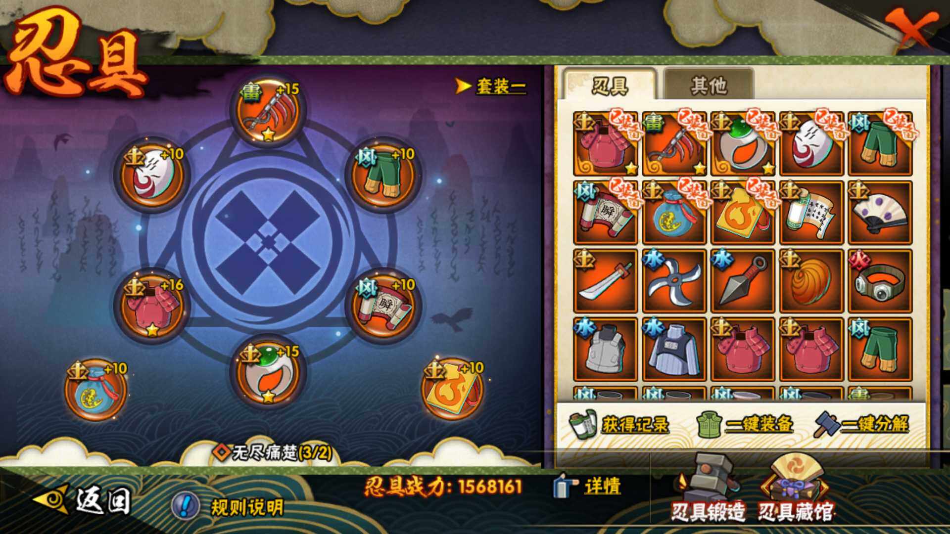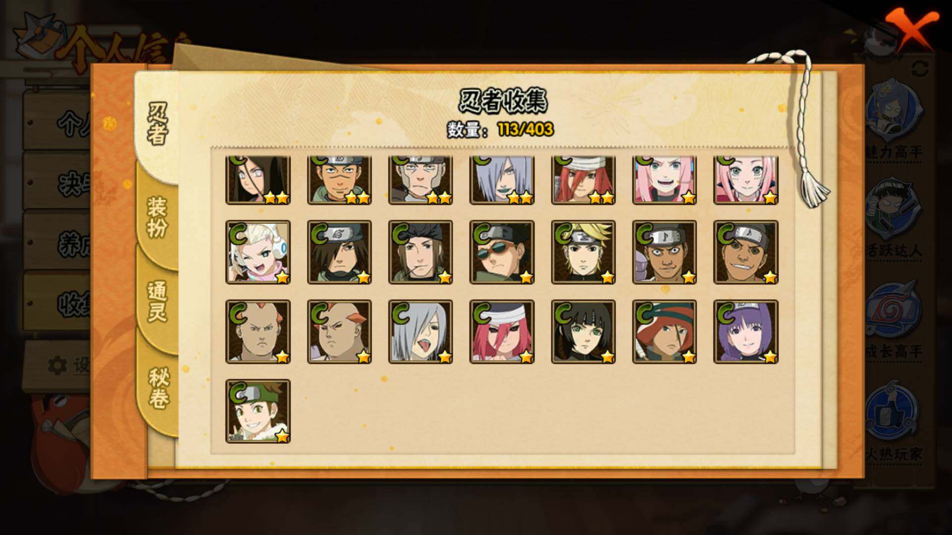 【S级忍者】:宇智波斑「秽土转生·解」(3星),艾「忍界大战」(3星),宇智波鼬「须佐能乎」(3星),宇智波止水「须佐能乎」(3星),旗木卡卡西「须佐能乎」(3星),自来也「舞之豪杰」(3星),自来也「传说中的三忍」(3星),波风水门(3星),佩恩「天道」(3星),宇智波佐助「永恒万花筒」(3星),大筒木桃式(3星)