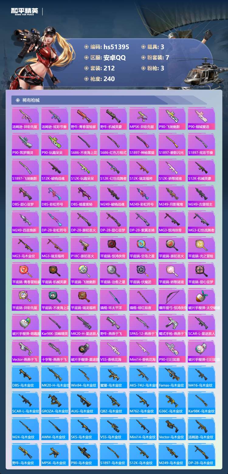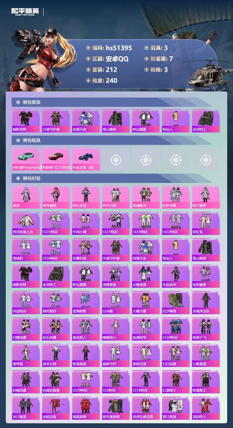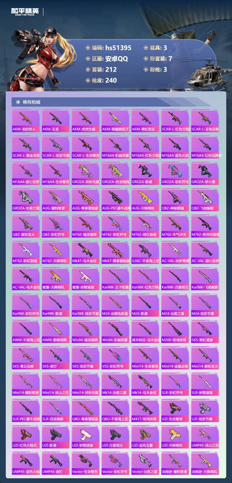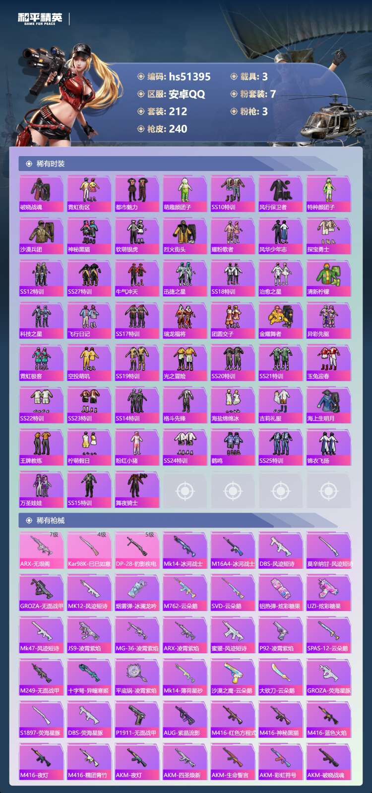 安卓手Q-13王牌印记-7粉装-3特效枪-3载具-80042热力值-212套装-24