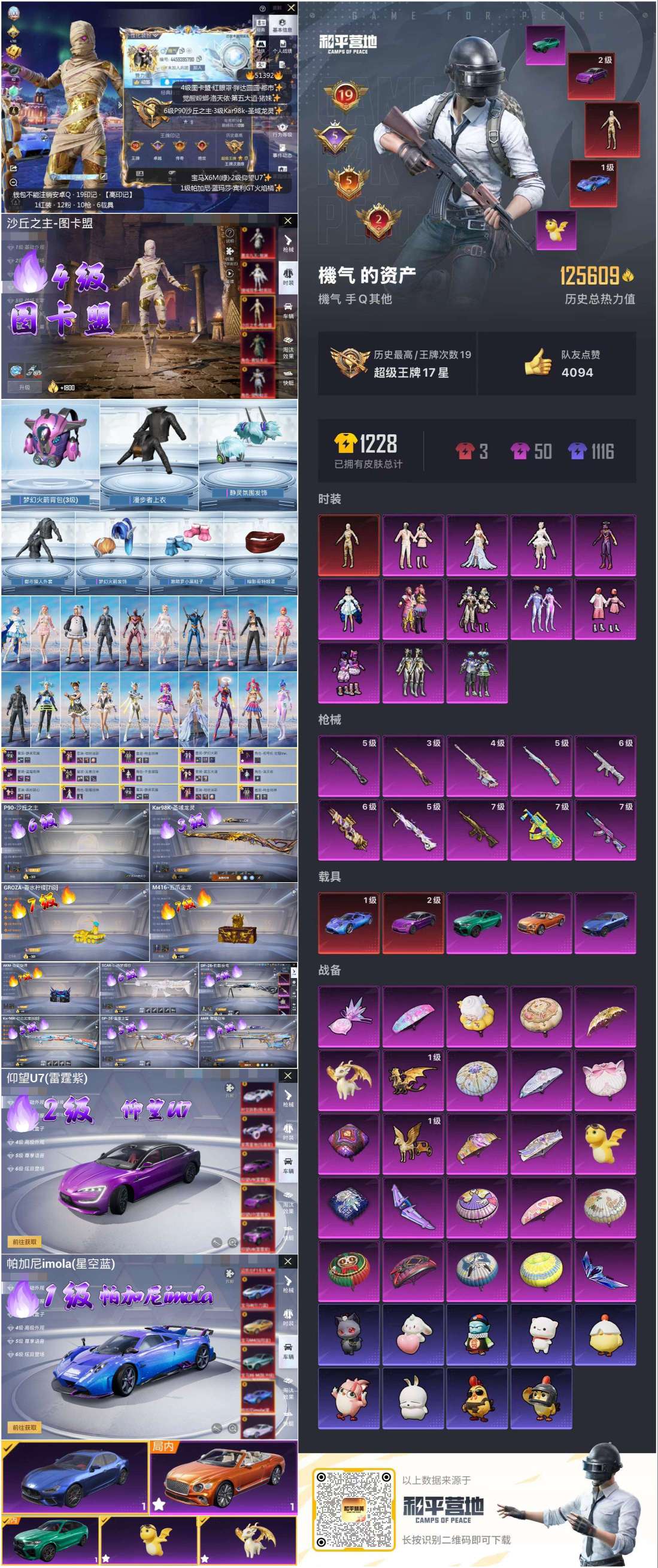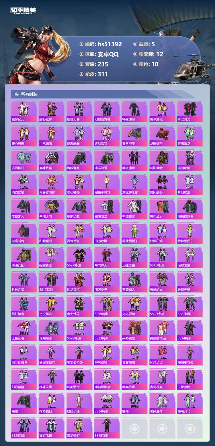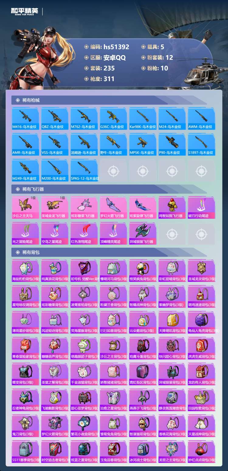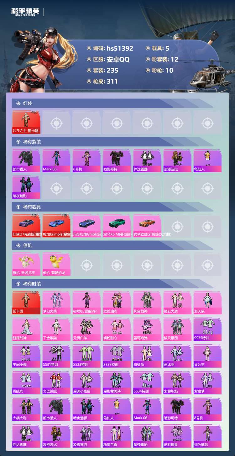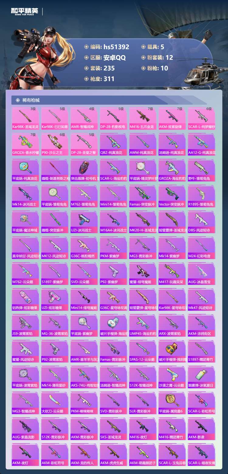hs51392 安卓手Q-19王牌印记-1红装-12粉装-10特效枪-5载具-125781热力值-2