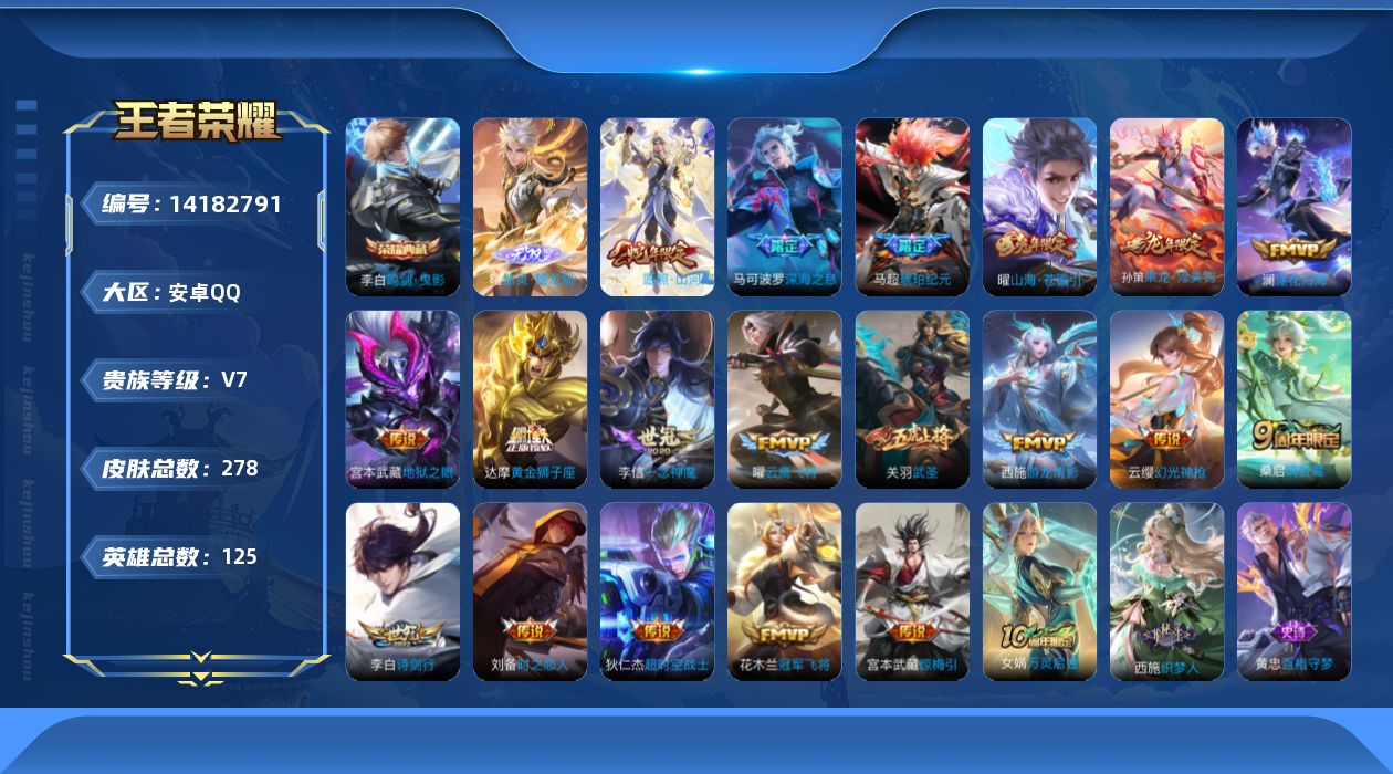 813-[14182791]贵族7-总皮278-1典藏-20传说-1无双-0珍品传说-0珍品无双-改名卡8-全皮5-时之思念 幽冥之眼 星际治安官 可二次 安卓手Q434区278皮1典藏20传说1无双V7 营地ID1768600629荣耀王者【无双皮肤】:器灵·螭龙剑【荣耀典藏】:鸣剑·曳影【优质限定皮肤】:至尊宝,武圣,山海·苍雷引【传说皮肤】:神树通天,黄金狮子座,超时空战士,愿照·山河定,幻光神枪,鸣野蒿,乘龙·淬吴钩,冠军飞将,琥珀纪元,逐花归海,一念神魔,云鹰飞将,深海之息,时之恋人,
