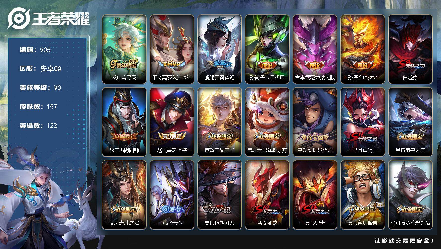 831-[14179416]贵族7-157皮0典藏6传说0无双 安卓手Q242区157皮0典藏6传说0无双V0 营地ID366936474秩序白银II【传说皮肤】:鸣野蒿,地狱火,久胜战神,末日机甲,地狱之眼,云霓雀翎【史诗皮肤】:曙光守护者,荣光圣徽,天才门将,金属风暴,乱世虎臣,黎明之约,乘风破浪,冰冠公主,无心,地狱岩魂,五谷丰年,热力回旋,冰雪圆舞曲,李小龙,暗影游猎,心灵战警,繁星吟游,驯魔猎人,苍穹之光,梁祝,水晶猎龙者,功夫厨神,狮舞东方,水果甜心,节奏热浪,白龙吟,魔术师,特
