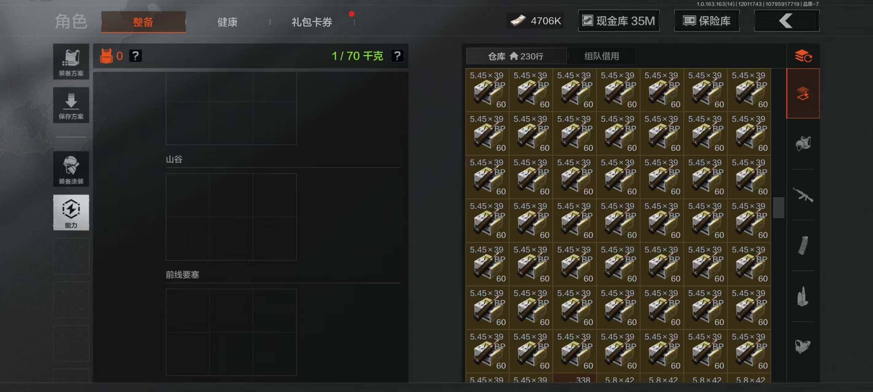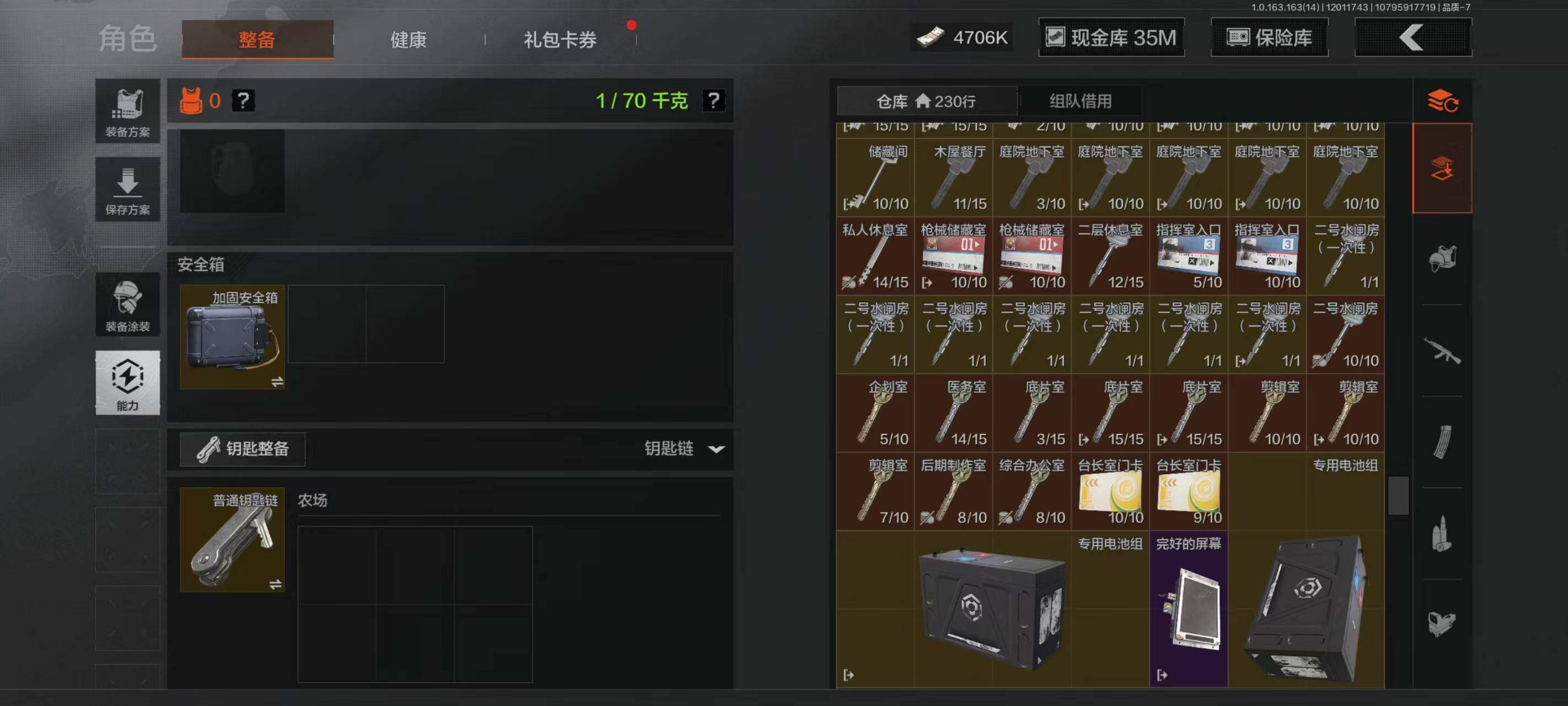 不可二次,仓库价值:98.2M,纯币:39706278,仓库还有57个大金,很多小金,还有很多子弹,配件,瀚星斩铁,开山刀,工兵铲,告丧夜曲·AUG,取你鸟命 挂饰