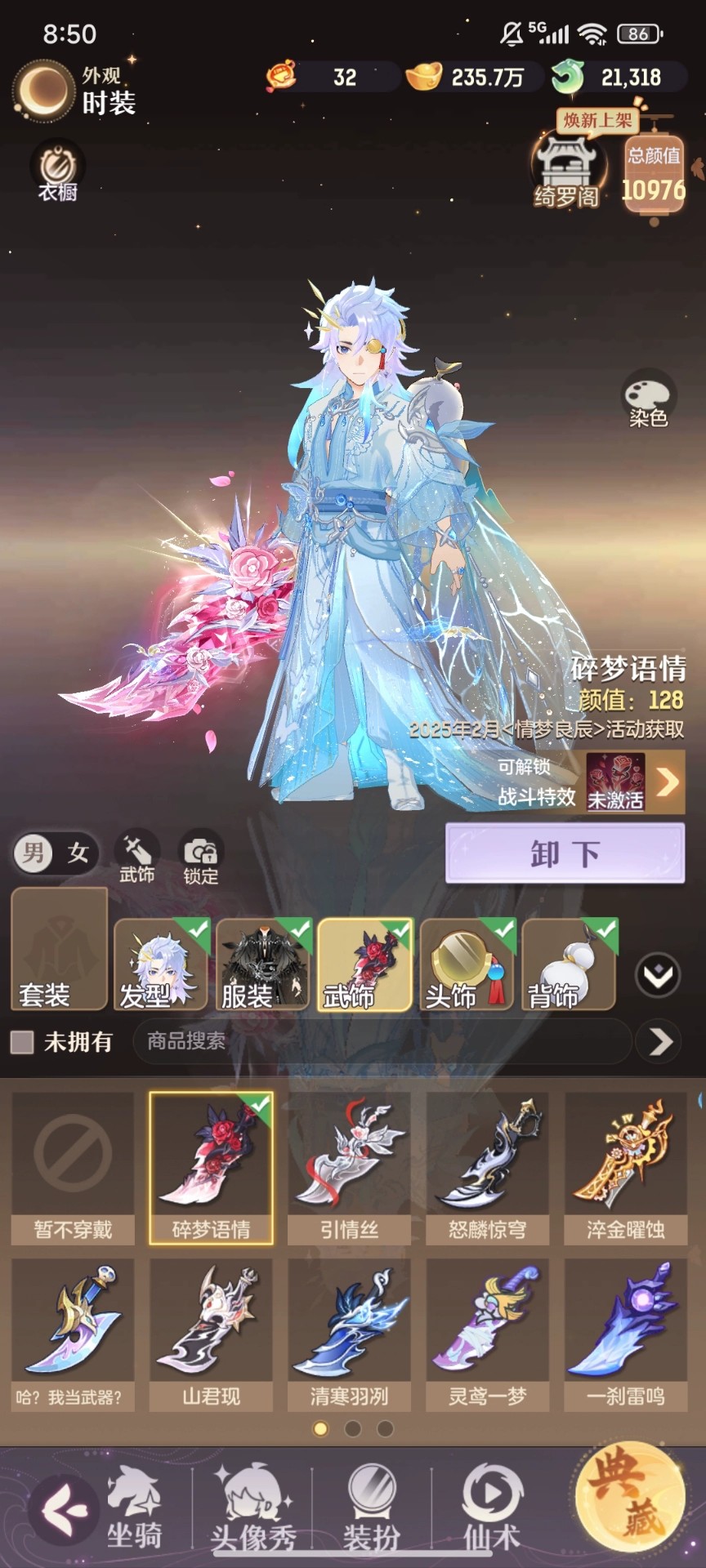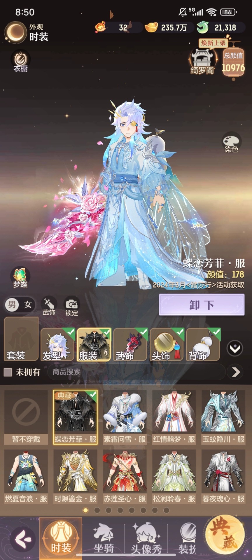 典藏时装,典藏坐骑,5800多法攻,10红5绝,宝宝全部毕业,带大小月卡,2W多玉