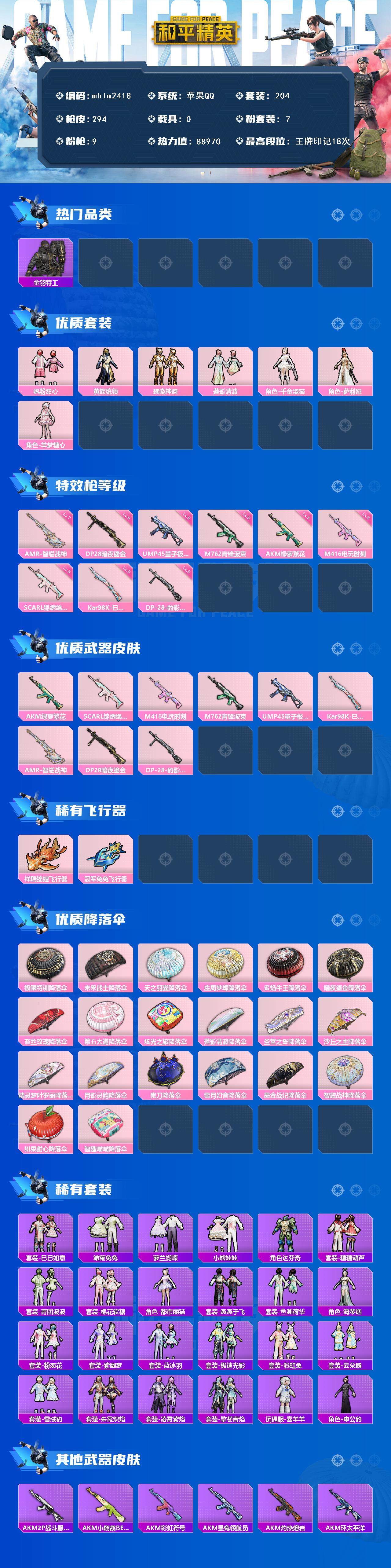 【mhlm2418】苹果 手Q-7粉装-9特效枪-0载具-3粉色飞行器-88970热力值-18王牌印记-204套装-294枪皮
