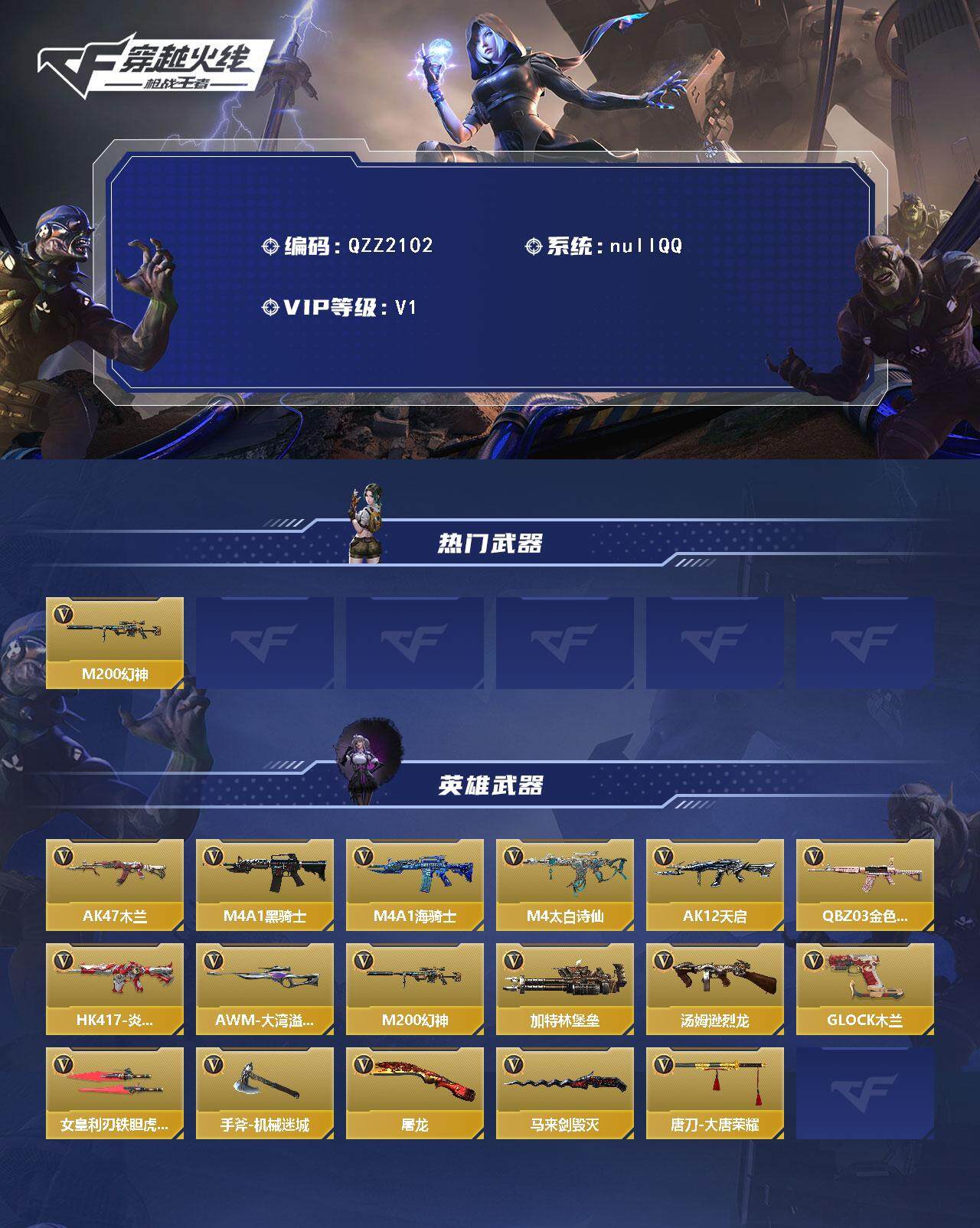 【QZZ2102】VIP1/33V/M200-幻神/AK47-木兰/M4A1-黑骑士/M4A1-海骑士/M4A1-太白诗仙/AK12-天启/QBZ03-金色蔷薇/HK417-炎龙铠甲/AWM-大湾溢彩/M200幻神/加特林-堡垒/汤姆逊烈龙/改装GLOCK-木兰/女皇利刃-铁胆虎魄/手斧-机械迷城/屠龙/马来剑-毁灭/唐刀-大唐荣耀