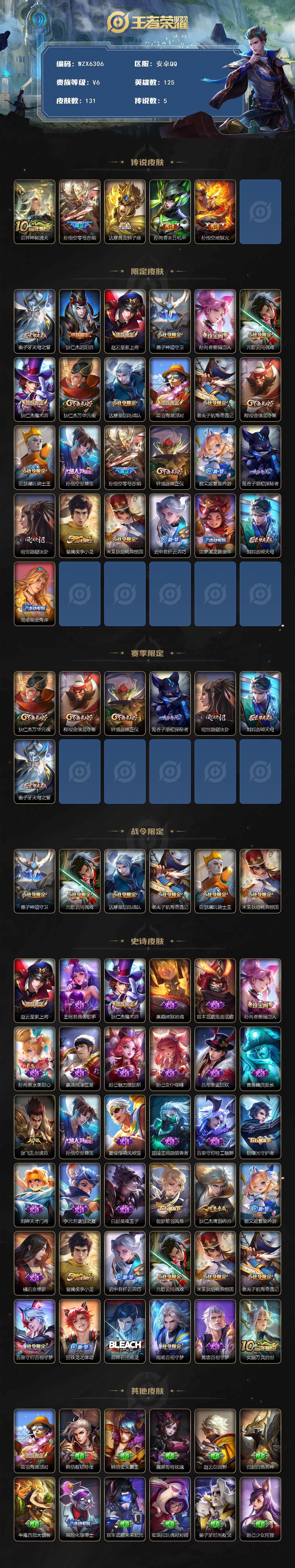 贵族6/皮肤131/传说5/史诗36/英雄125/