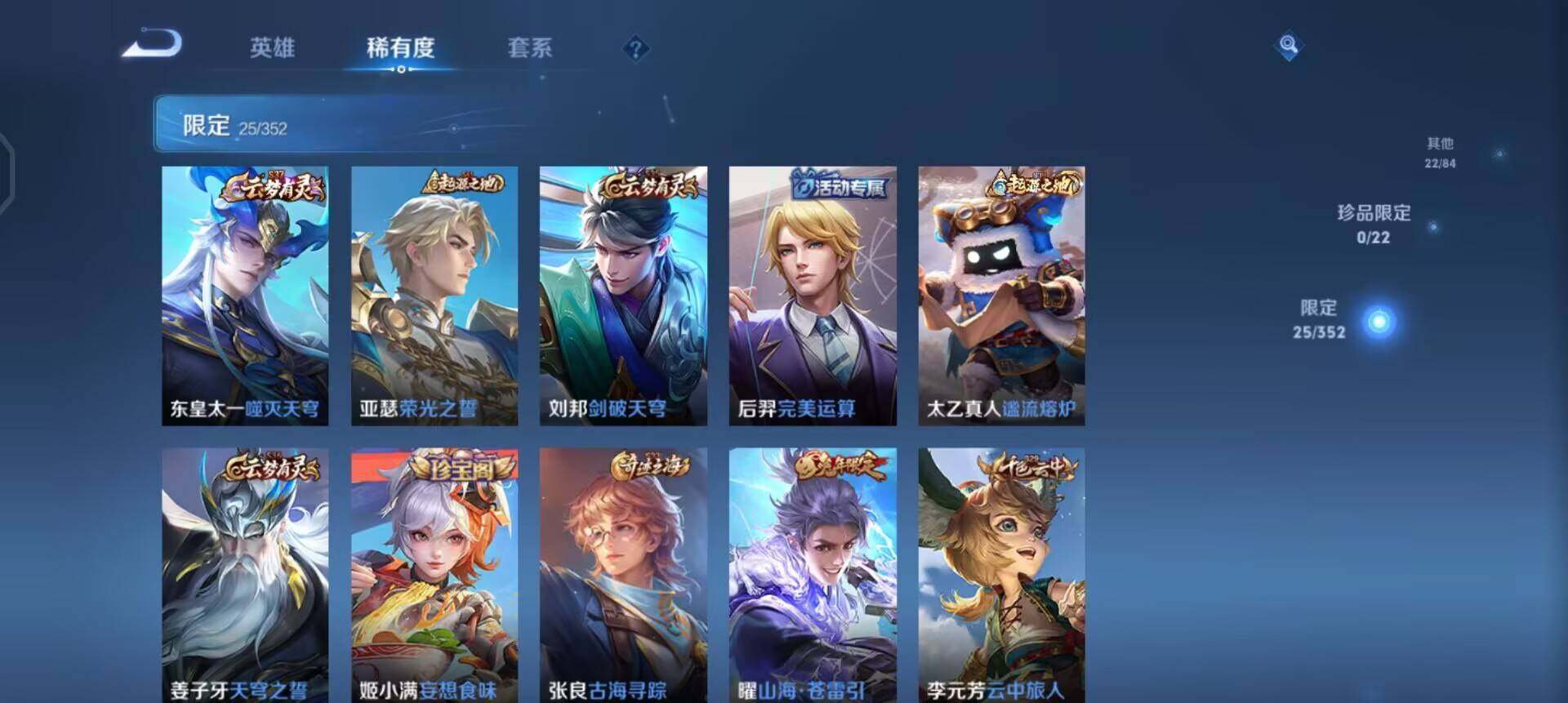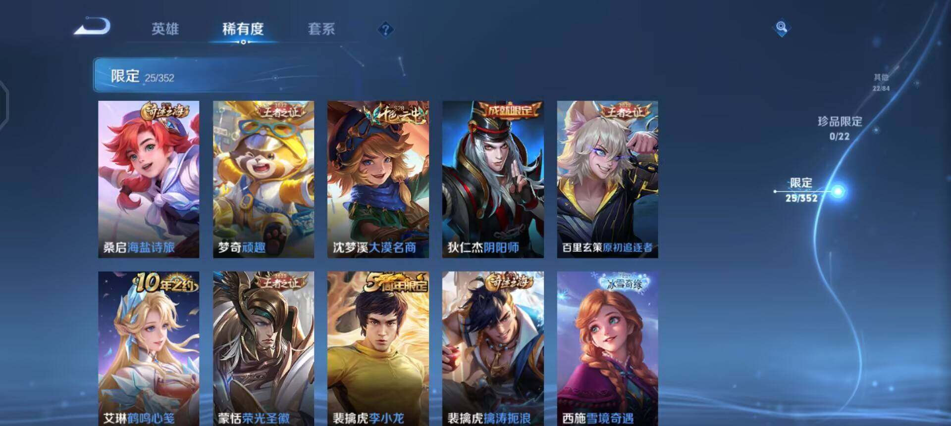 【限定皮肤】:姜子牙天穹之誓,狄仁杰阴阳师,项羽海滩派对,李元芳云中旅人,鬼谷子五谷丰年,百里玄策原初追逐者,梦奇顽趣,沈梦溪大漠名商,裴擒虎李小龙,裴擒虎擒