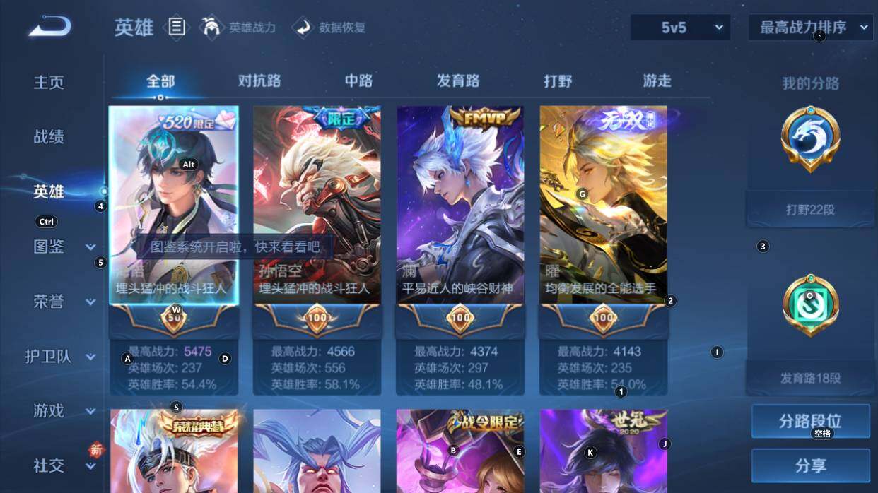 1星传说,21按键,打野22段发育18段,中路对抗16段,星币3404,贵族积分100692,安卓Q-V9-126英雄-349皮肤-1典藏皮肤-1无双-30传说-95史诗