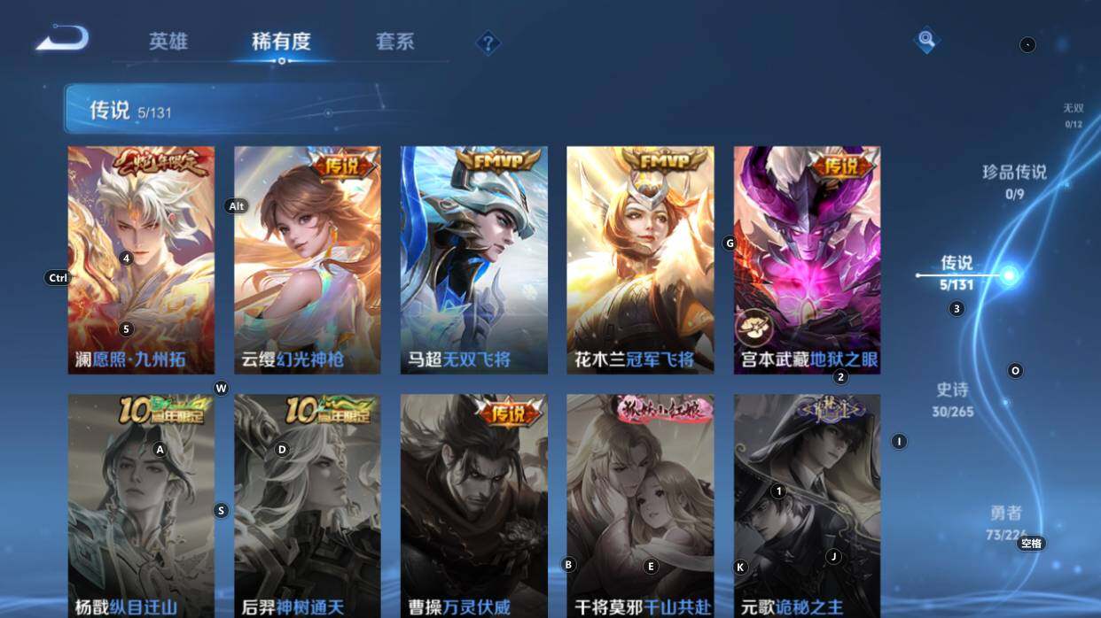 【传说皮肤】:澜愿照九州拓,云缨幻光神枪,马超无双飞将,花木兰冠军飞将,宫本武藏地狱之眼