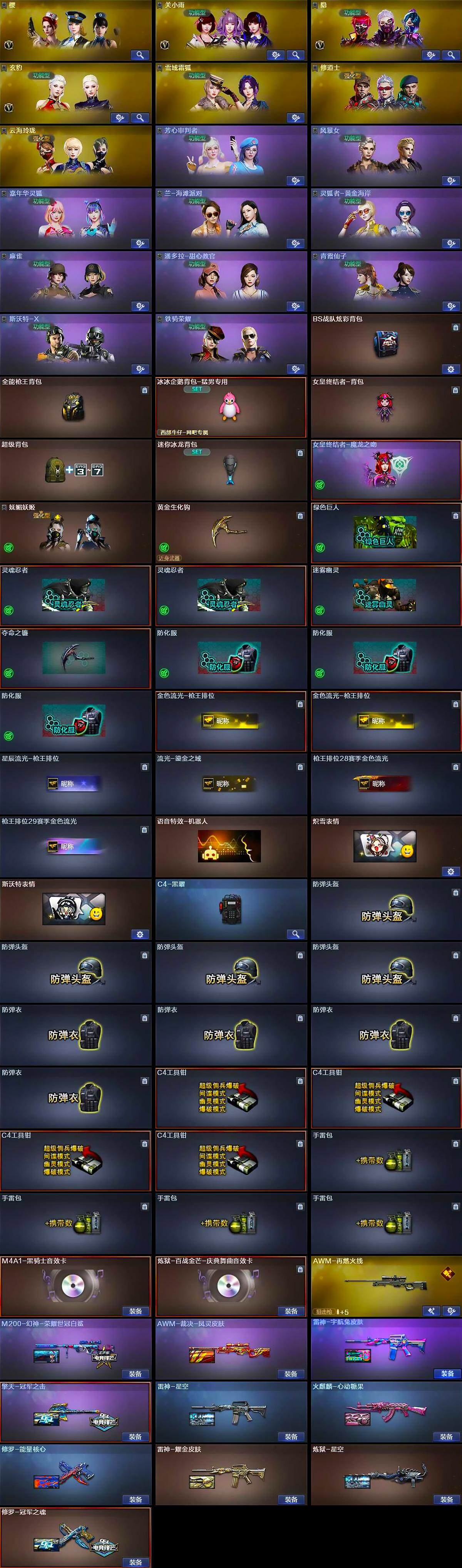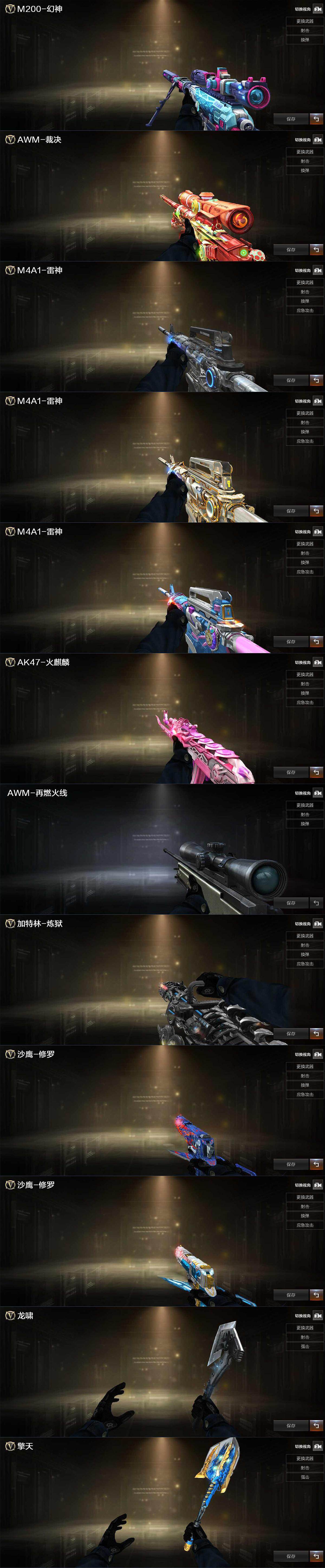 【热门武器】:传说夜影,QBZ03-金色蔷薇,M200-幻神,金色小号,C.A.T,毒蜂,M4A1-黑骑士,汤姆逊-烈龙,沙鹰-修罗*2,炽芒蝶刃,金刚伞*2