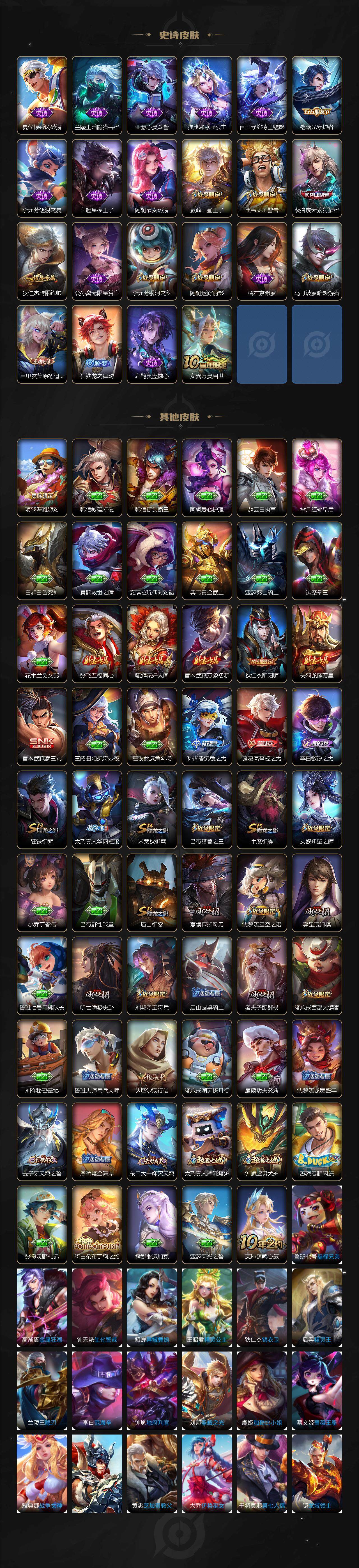 【传说皮肤】:桑启鸣野蒿,虞姬启明星使,伽罗太华,貂蝉猫影幻舞,干将莫邪久胜战神,达摩黄金狮子座,花木兰冠军飞将,后羿黄金射手座,杨戬永曜之星,貂蝉仲夏夜之梦,李白凤求凰,孙尚香末日机甲,宫本武藏地狱之眼