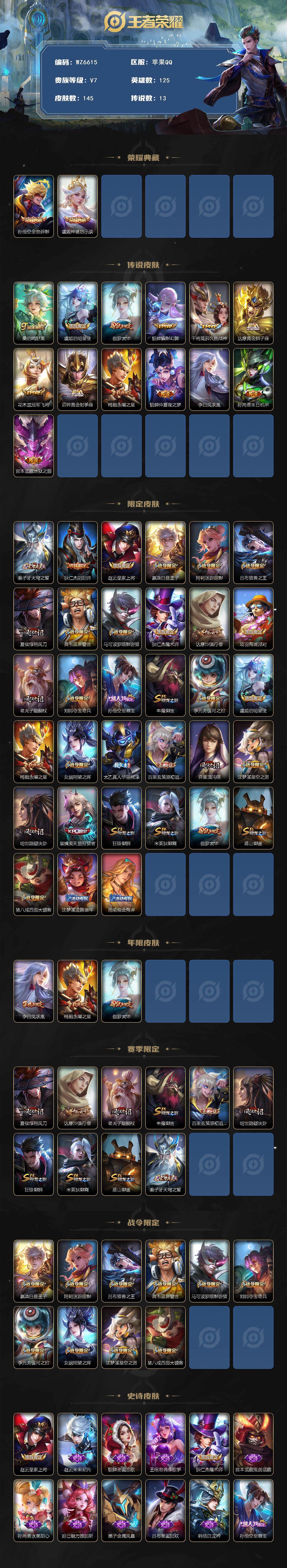 /苹果Q-V7-最强王者段位-125英雄-145皮肤-2典藏-0珍品无双-0无双-0珍品传说-13传说-34史诗