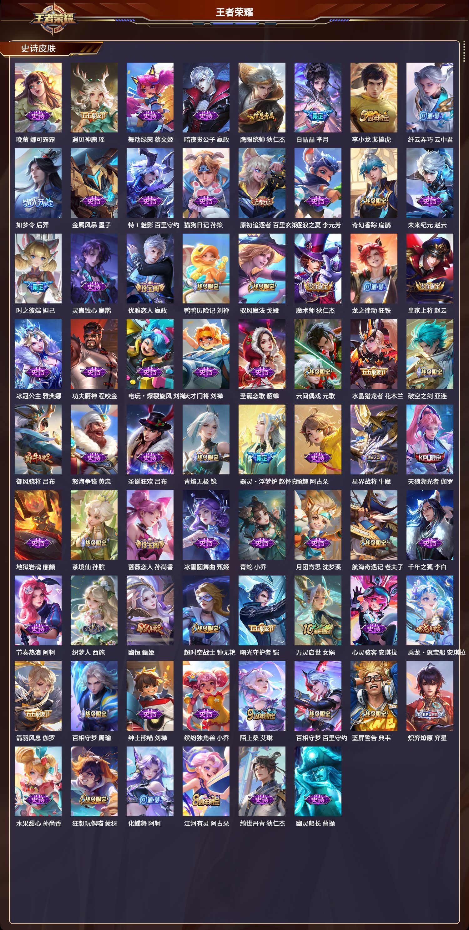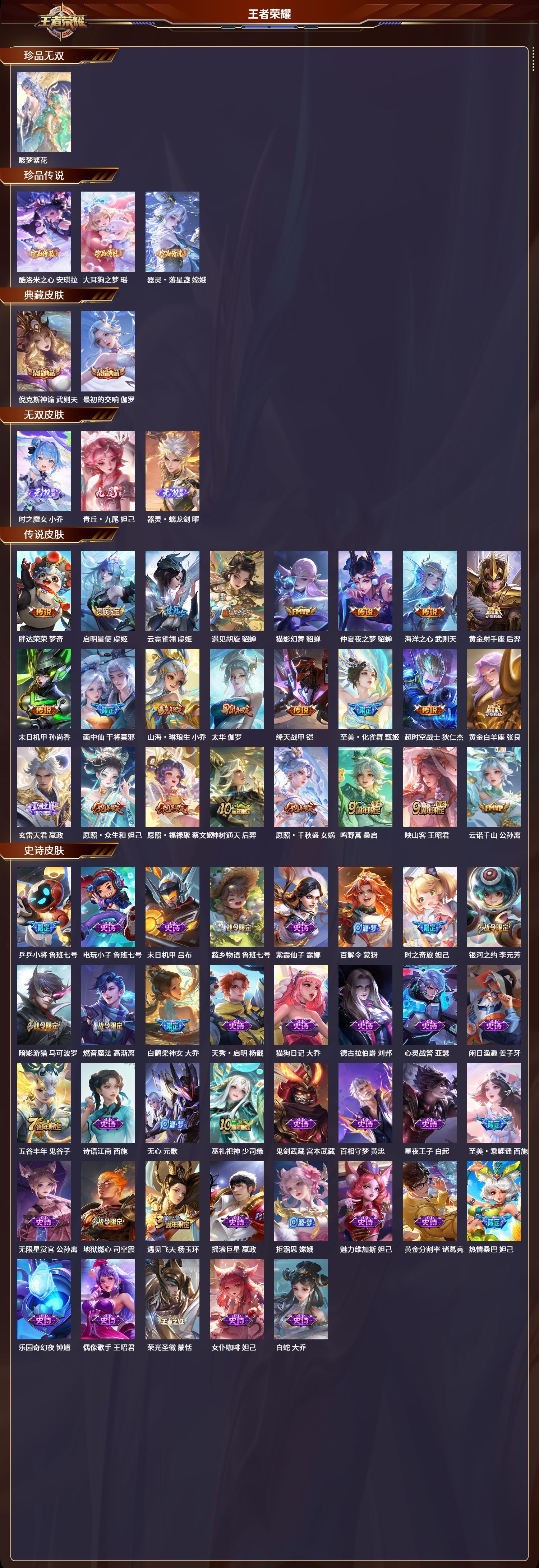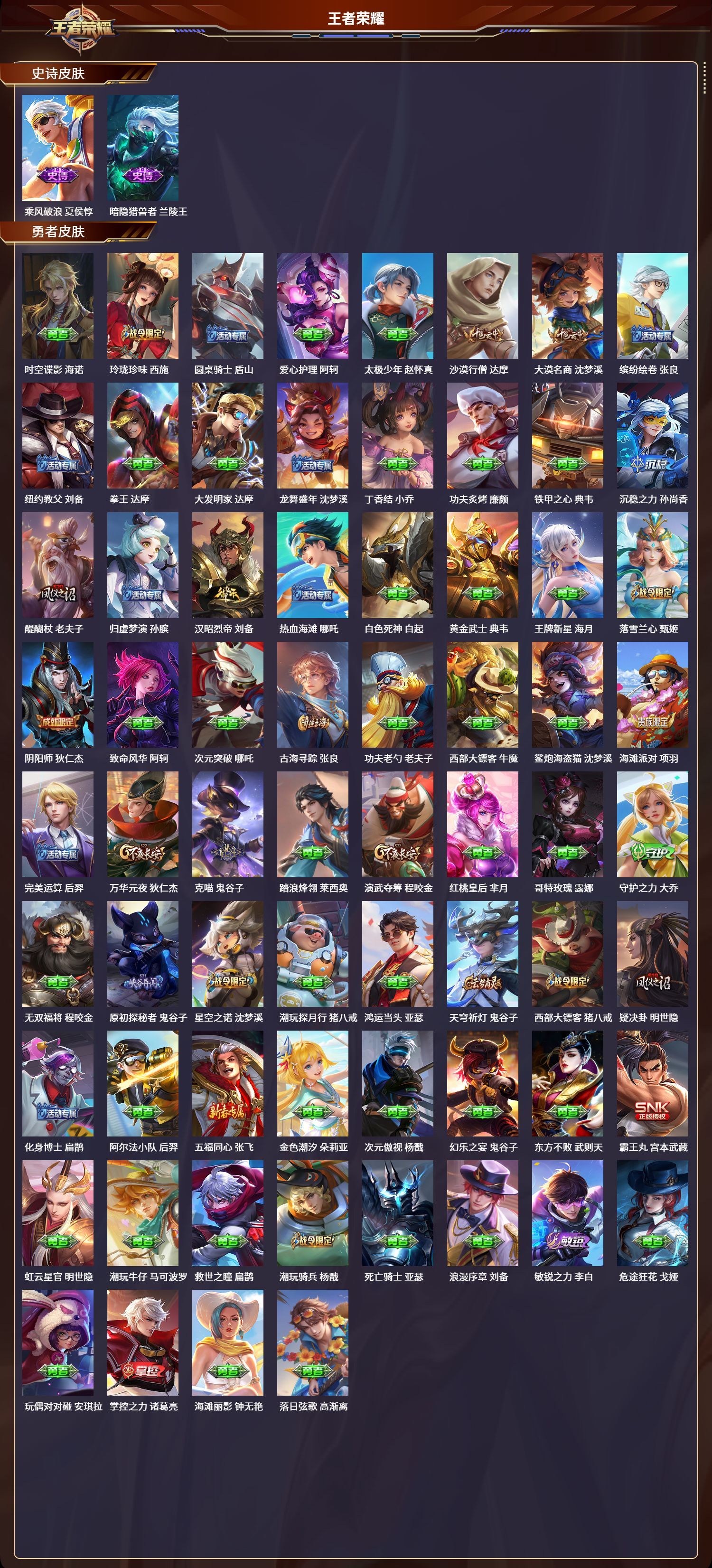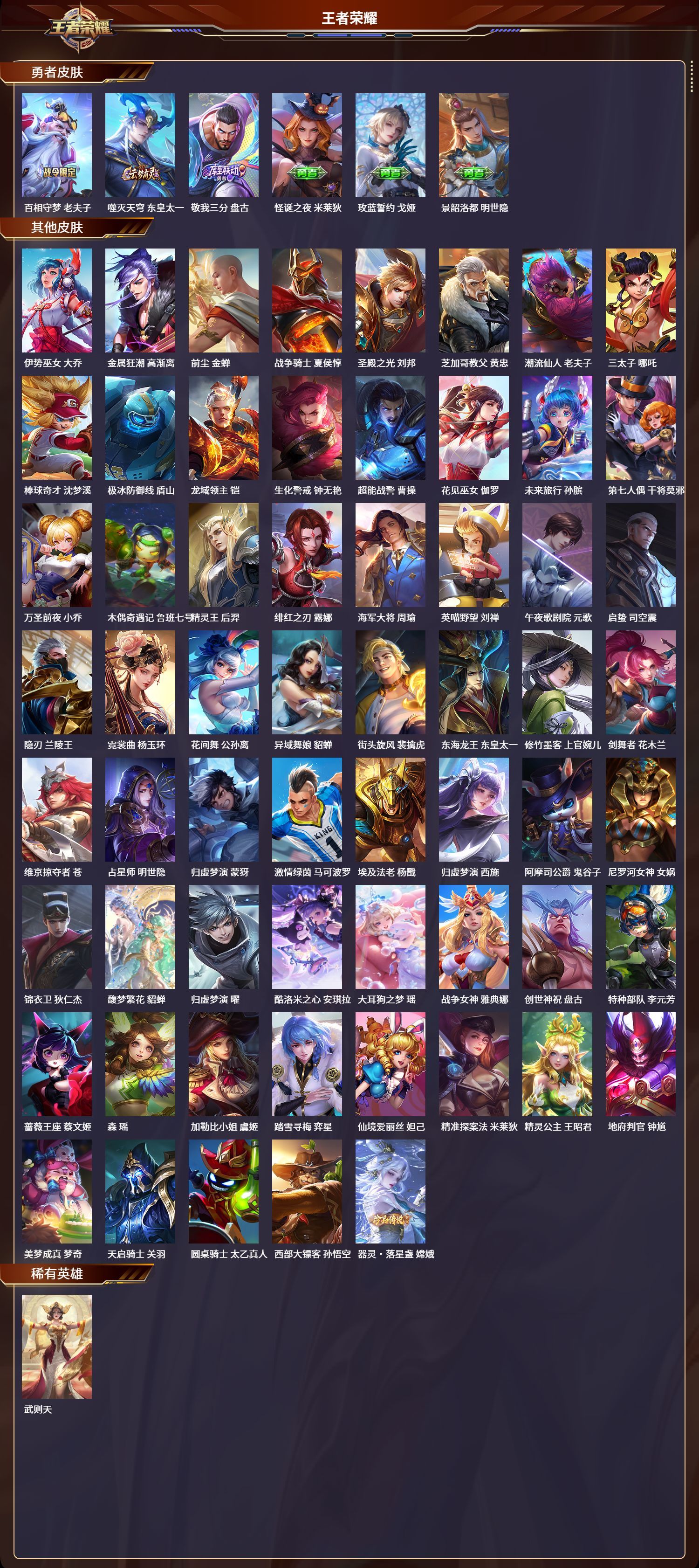 安卓QQ/非凡王者/343皮肤/128英雄/2典藏/1珍品无双/3无双/3珍品传说/24传说/109