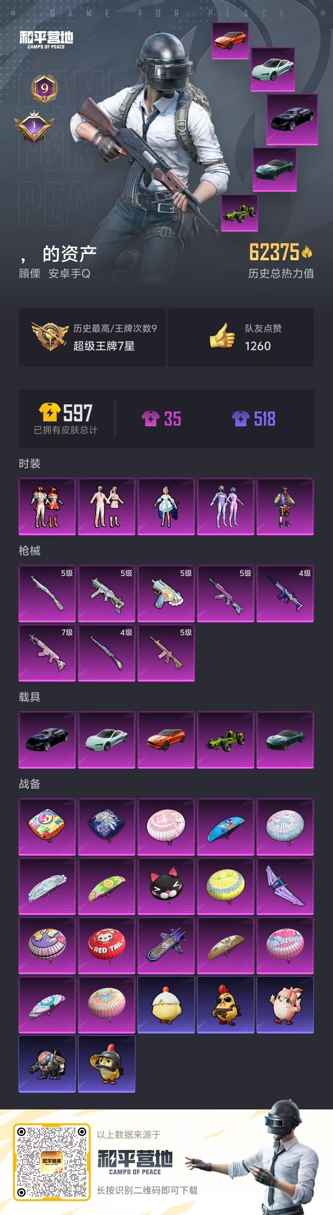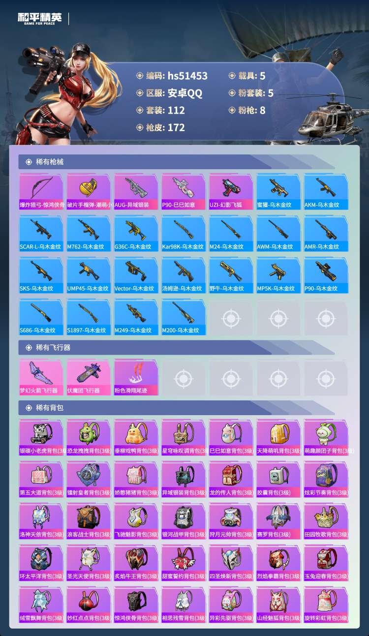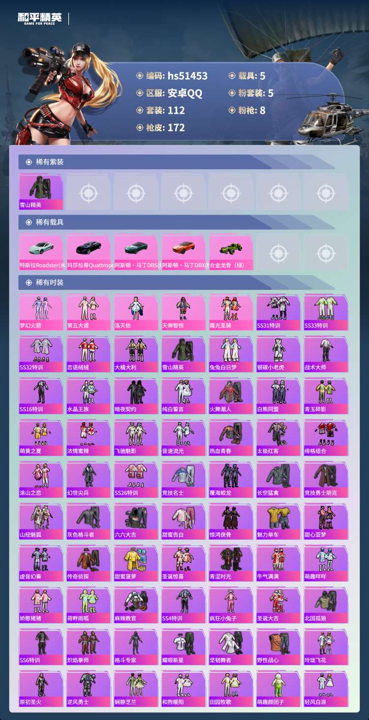 hs51453 安卓手Q-9王牌印记-5粉装-8特效枪-5载具-62375热力值-112套装-172