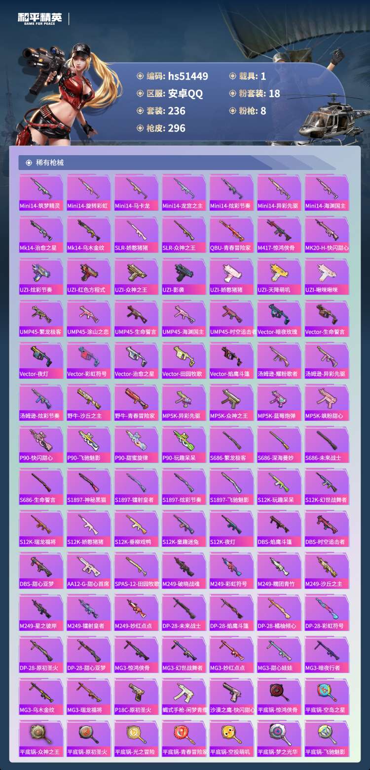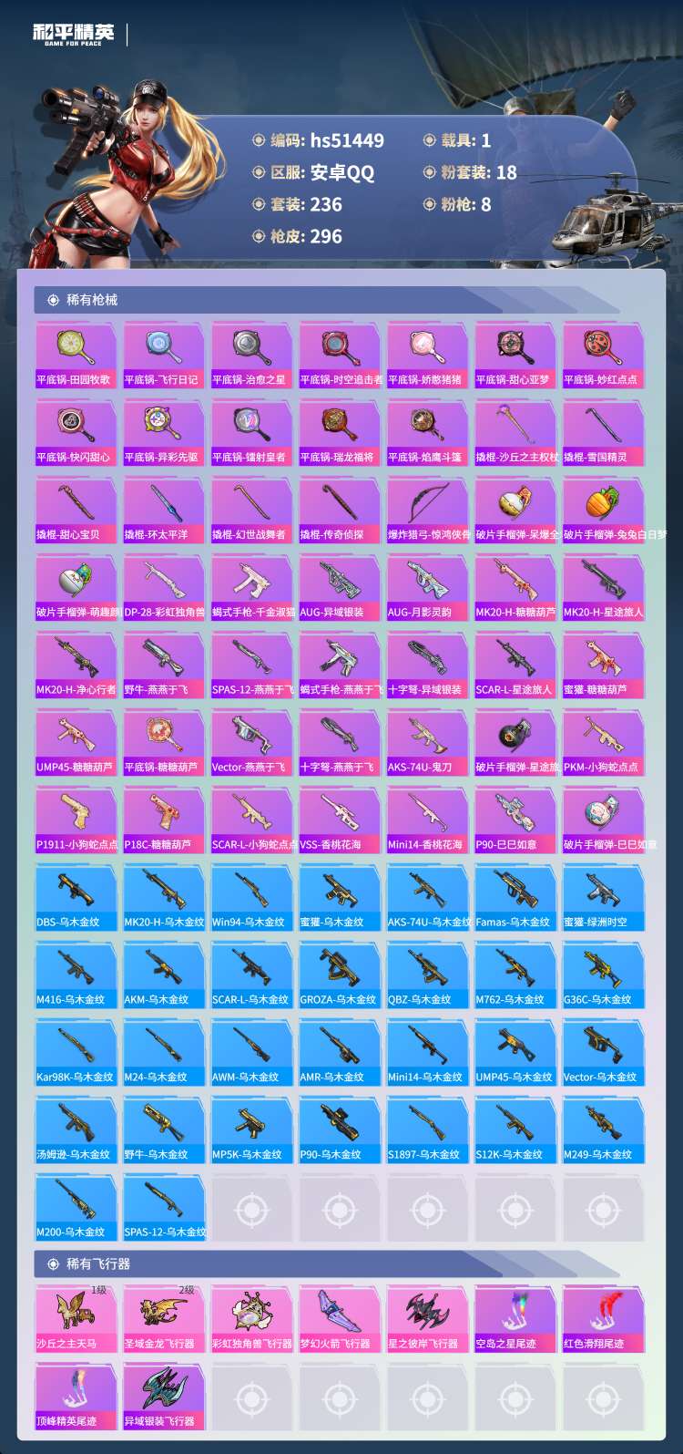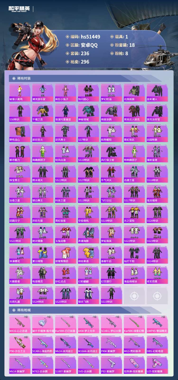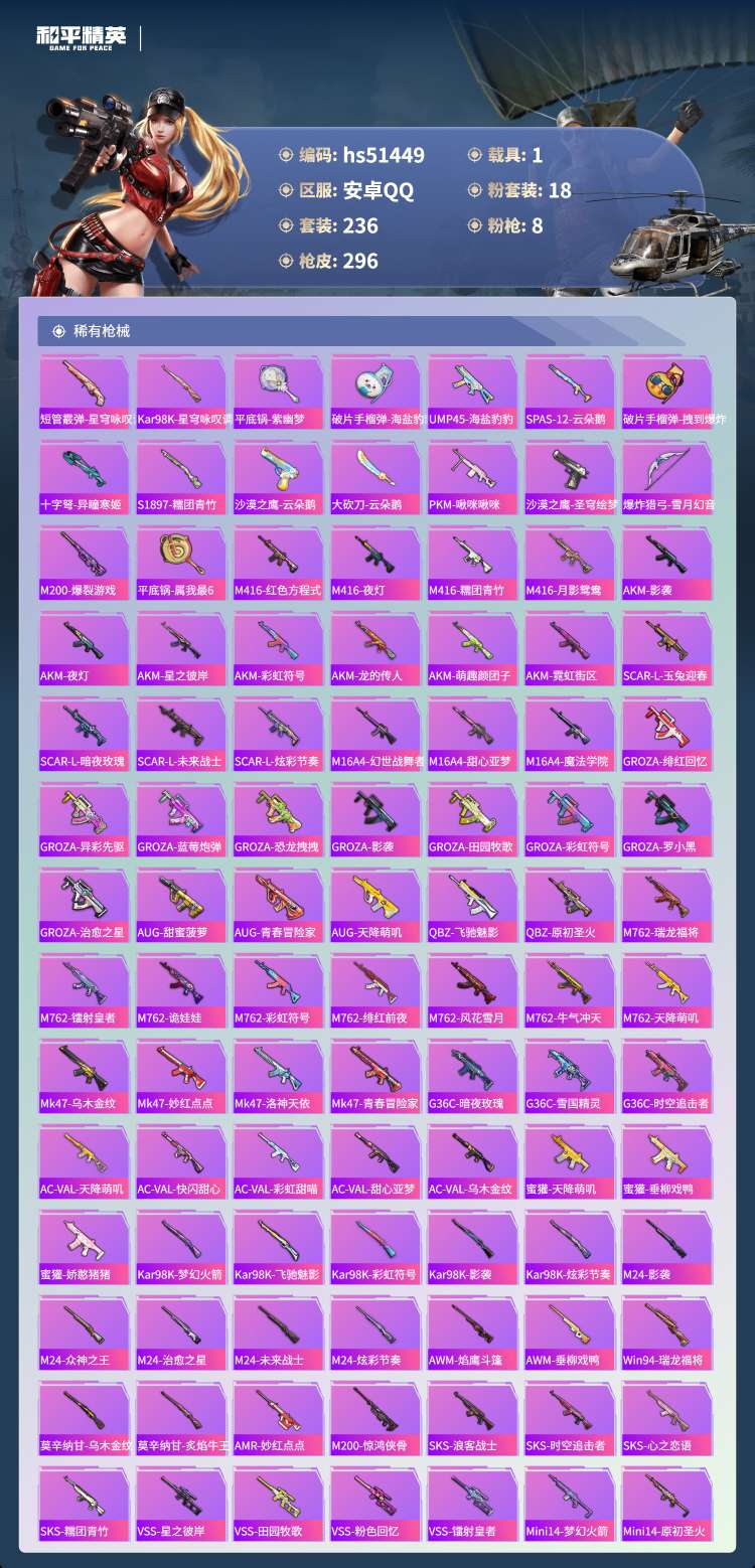 hs51449 安卓手Q-18王牌印记-有战神框-18粉装-8特效枪-1载具-108940热力值-2
