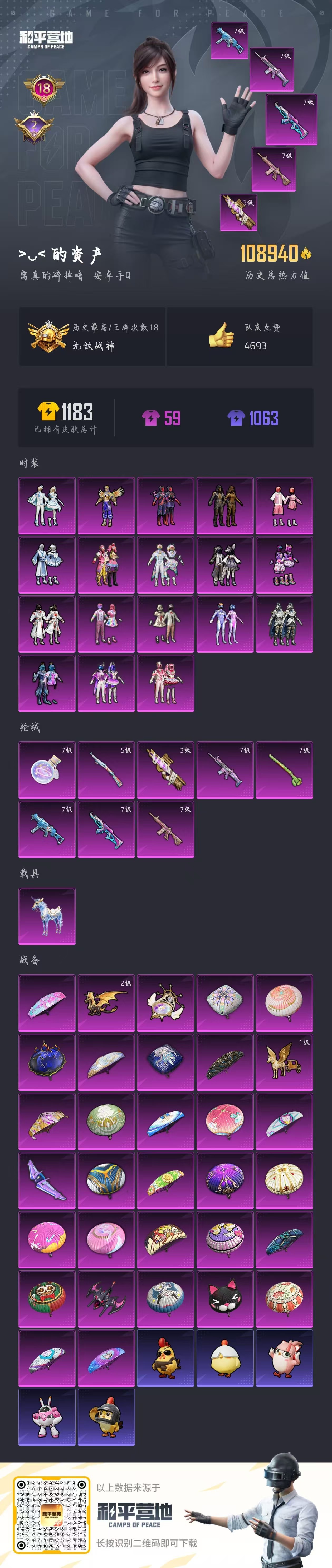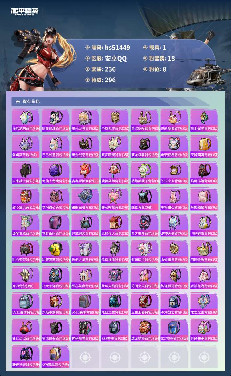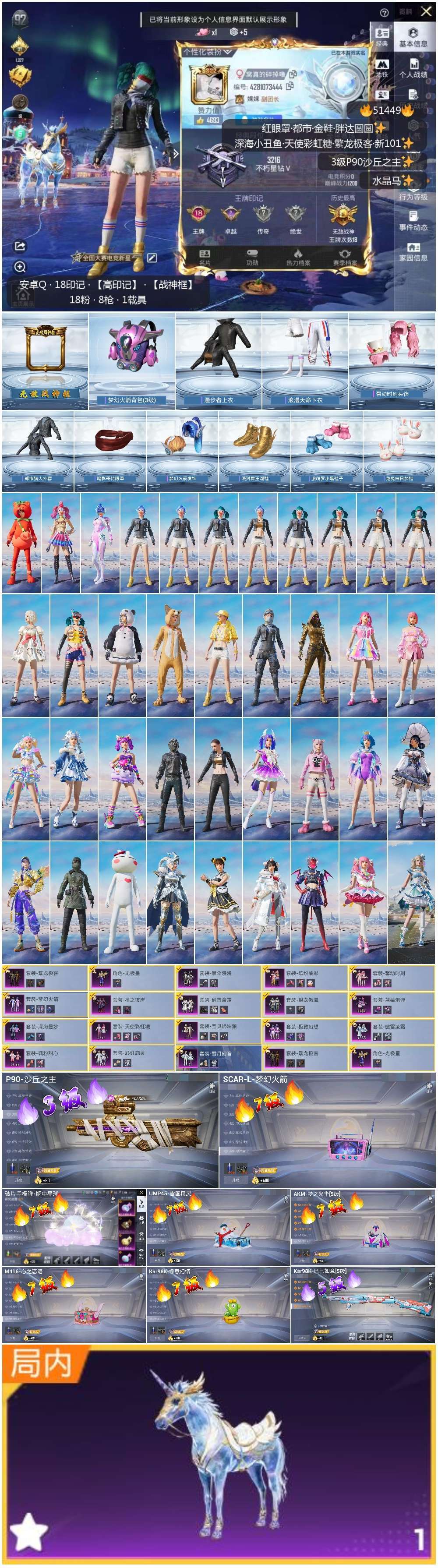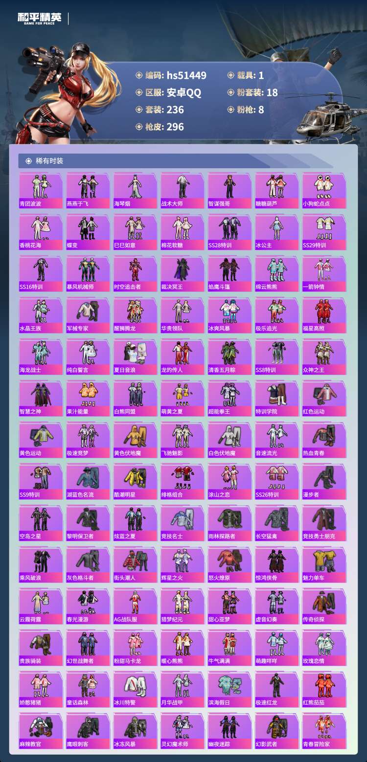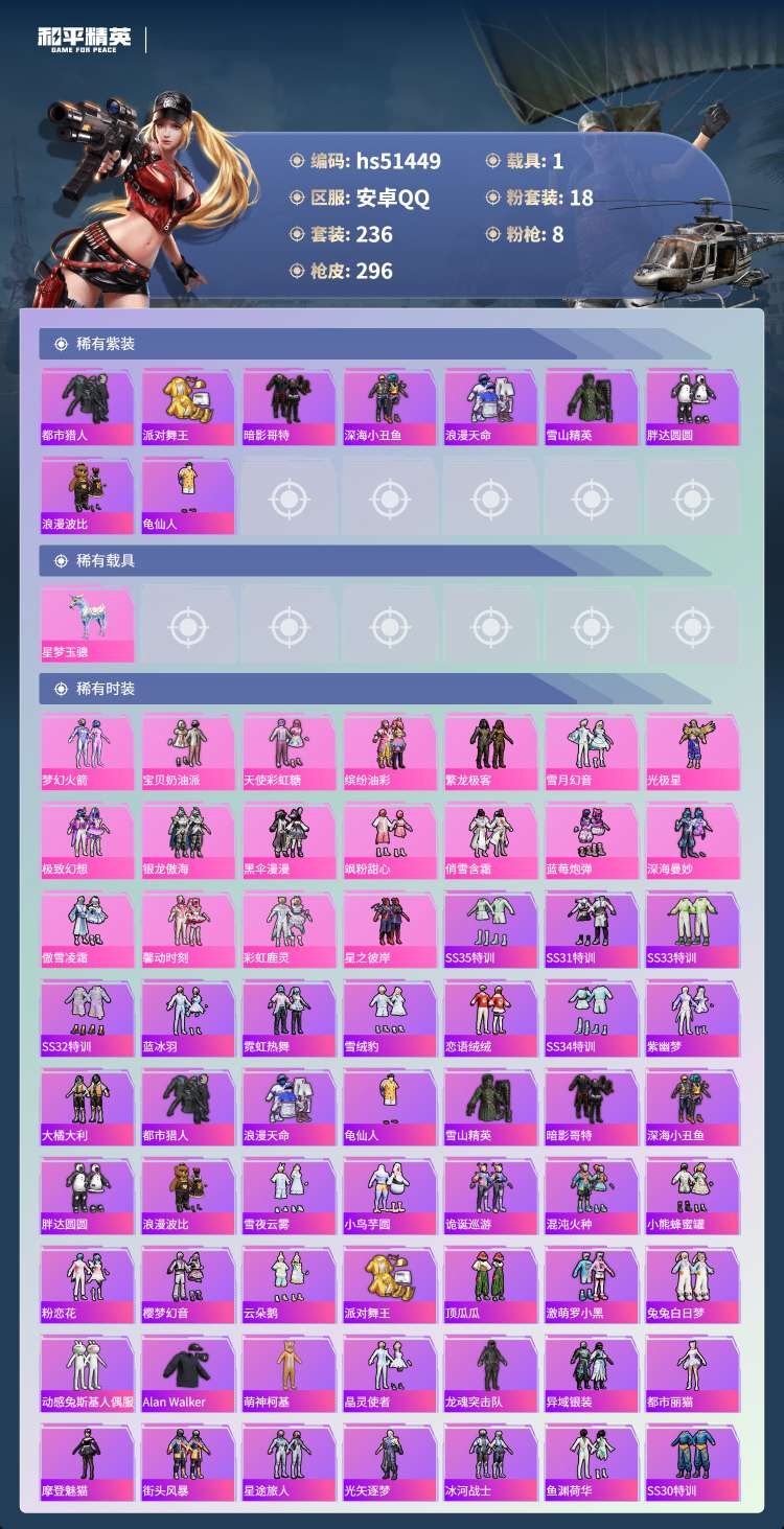 hs51449 安卓手Q-18王牌印记-有战神框-18粉装-8特效枪-1载具-108940热力值-2