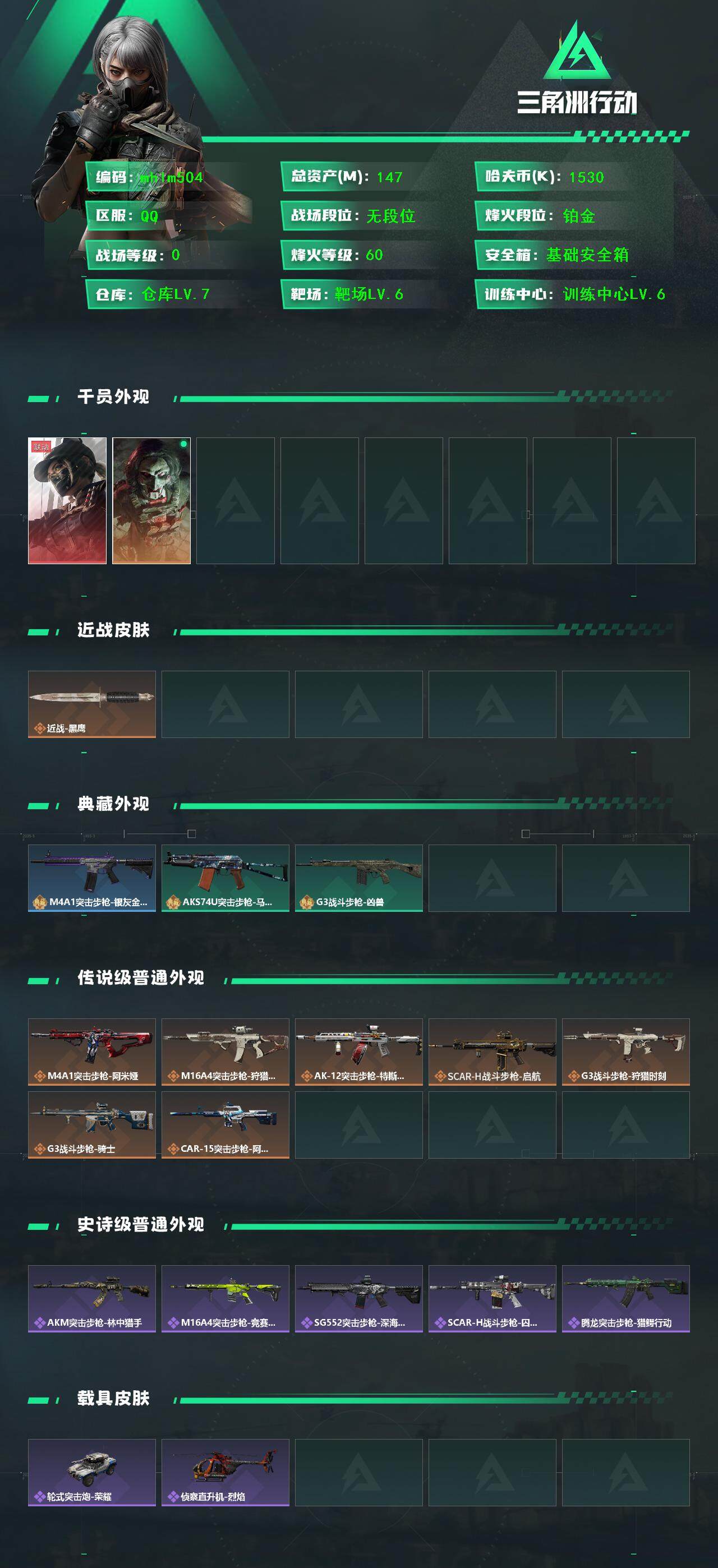 【mhlm504】总资产:147.1M,哈夫币:153W,武器皮肤106,烽火60级:铂金,通行证31级:通行证免费版 【安全箱】基础安全箱;【特勤处等级】仓库LV.7,指挥中心LV.6,训练中心LV.6,靶场LV.6,潜水中心LV.2,收藏室LV.1;【干员皮肤2】:露娜黑天际线,红狼电锯惊魂;【已有捆绑包3】:特斯拉线圈捆绑包,狩猎时刻捆绑包,黑天际线捆绑包;【近战皮肤】:近战武器-黑鹰;【
