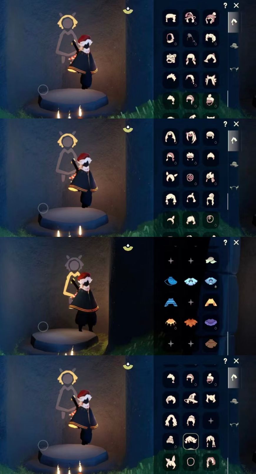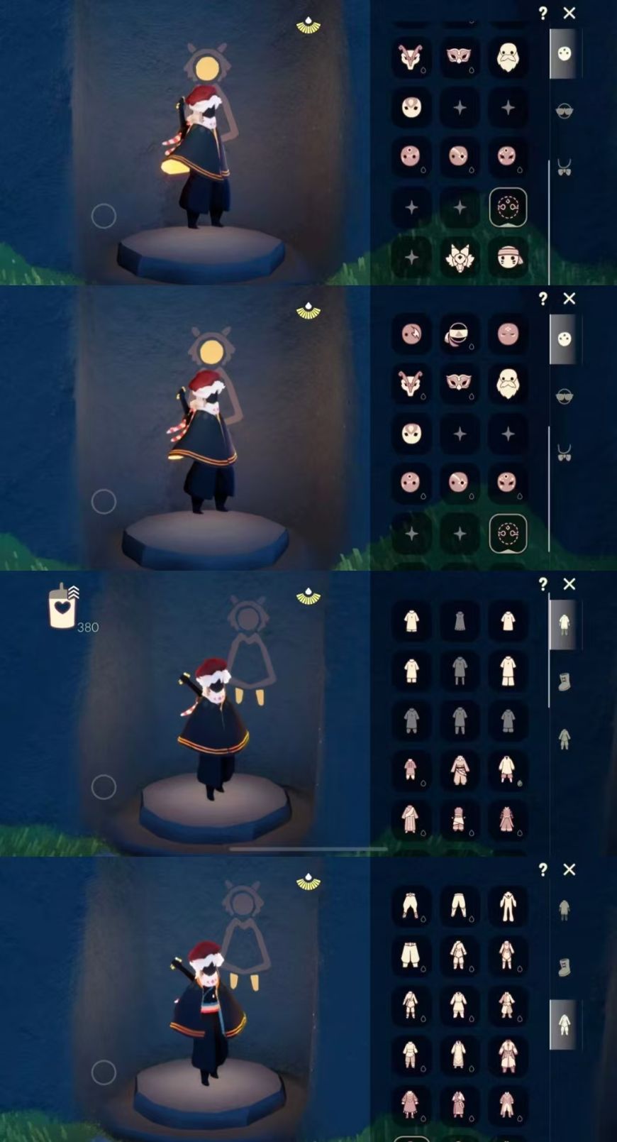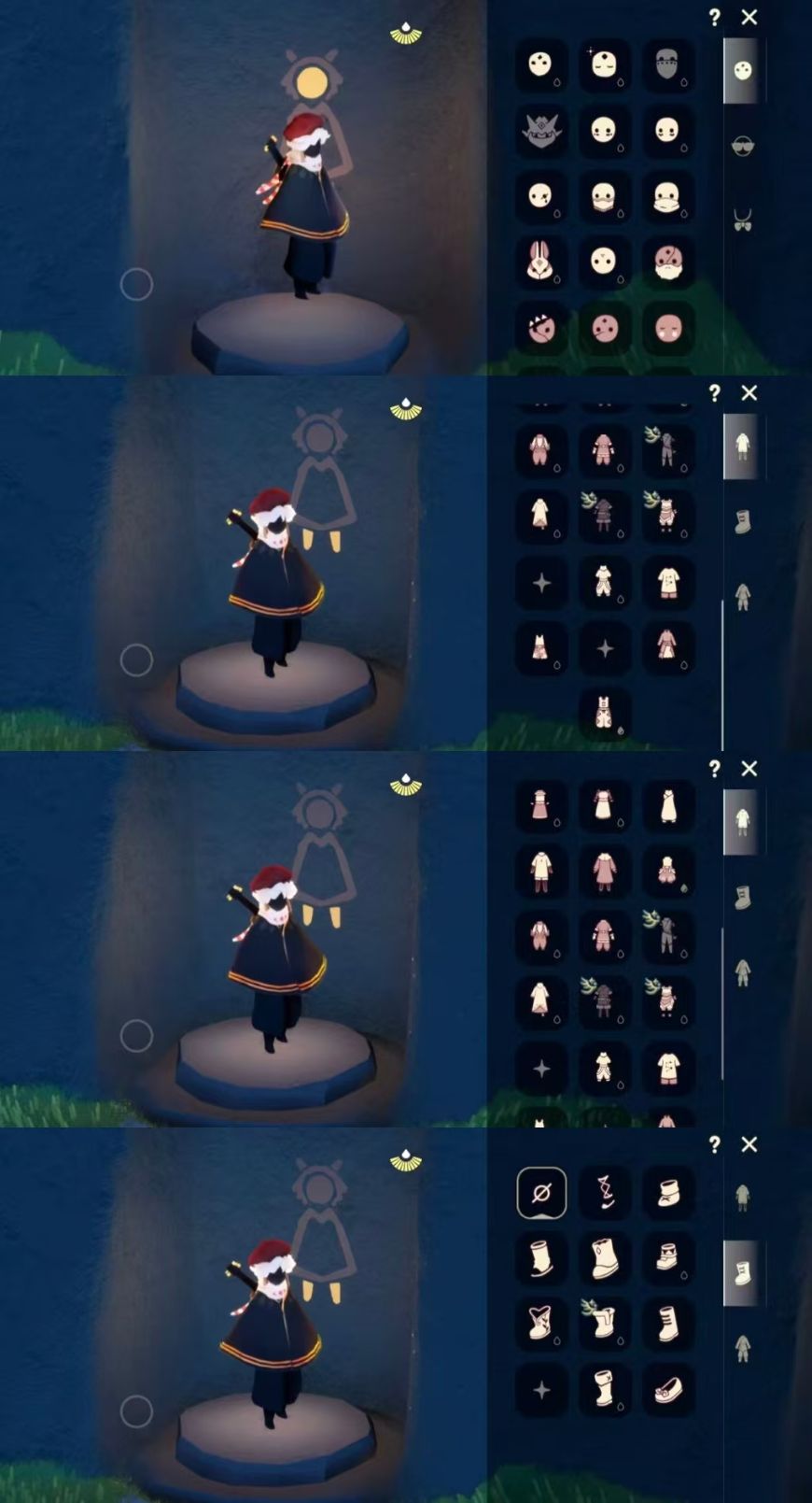 区服:国服ios登入方式:手机'蜡烛数量:380翼数量:93爱心:38身高:1.5已经毕业地图:霞谷'已经毕业季节:青鸟季,姆明季,二重奏季礼包数量:2稀有礼包:彩虹武士裤,彩虹耳饰热门物品:公主头,正太头,樱花头,猫猫头,武士裤,花环头饰,宴会围巾,虚荣发型,花瓣斗篷,吉他,笛子,铃铛,雨伞其他亮点:迁徙季季卡