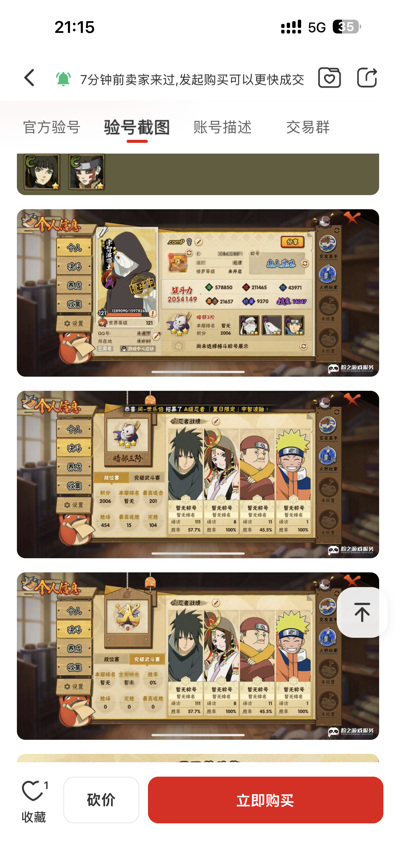 通过App,与卖家商议价格及保险,并向卖家索要账号最新截图,确认后下单购买。