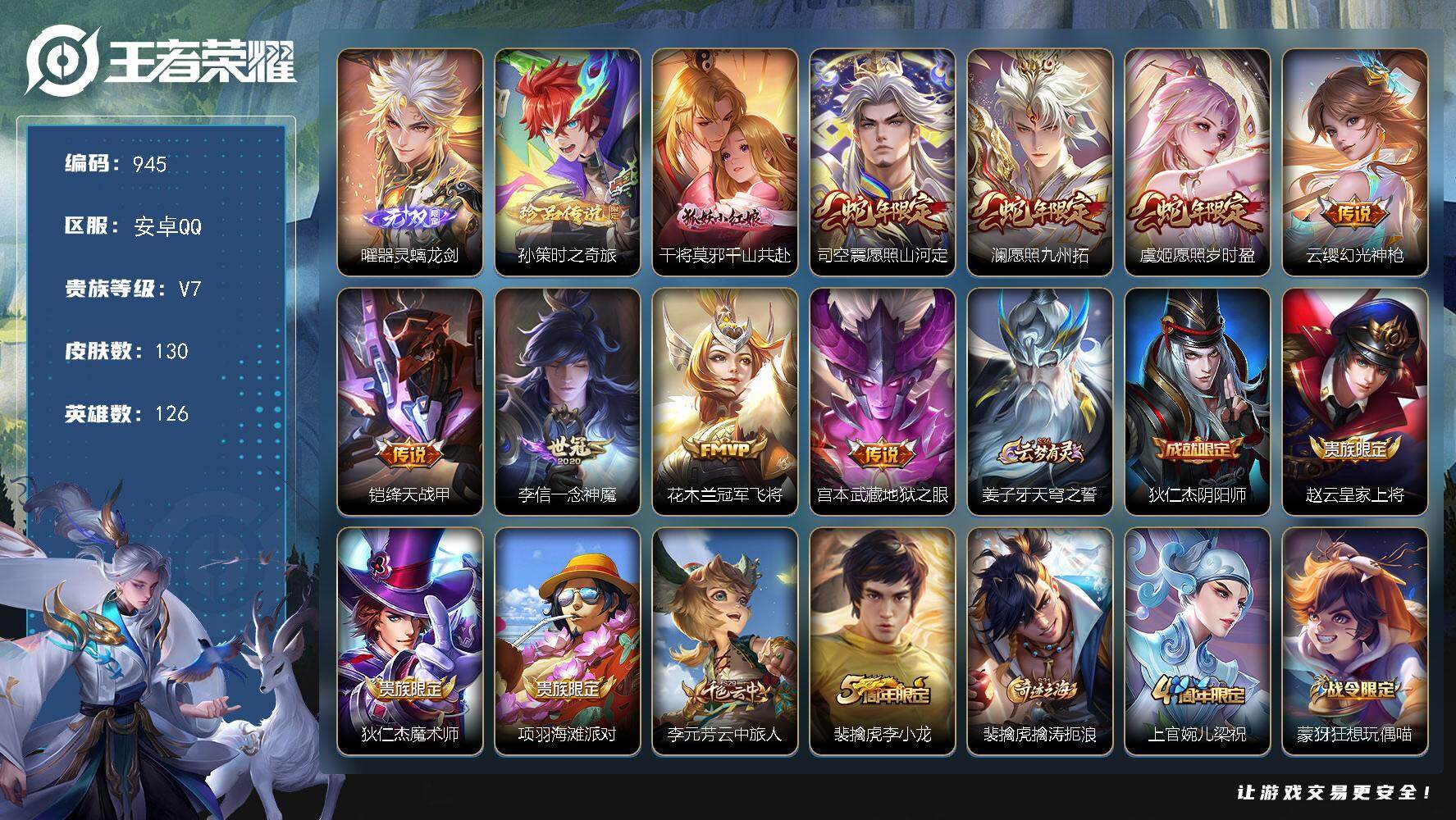 247-[14207436]可二次 贵族7-贵族积分28450-130皮0典藏9传说1无双1珍品传说 安卓手Q440区130皮0典藏9传说1无双1珍品传说V7 营地ID1671418420至尊星耀II【珍品传说皮肤】:时之奇旅【无双皮肤】:器灵·螭龙剑【传说皮肤】:千山共赴,冠军飞将,幻光神枪,一念神魔,地狱之眼,愿照·岁时盈,愿照·山河定,愿照·九州拓,绛天战甲【史诗皮肤】:梁祝,冰冠公主,舞动绿茵,涂山容容,东方月初,织梦人,赞萌露比,女仆咖啡,狂想玩偶喵,天才门将,龙之律动,鸭鸭历