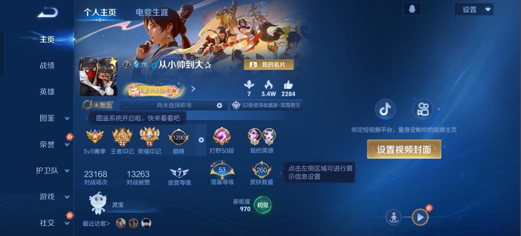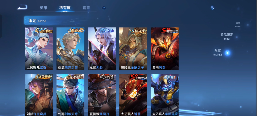 实名: 不可修改 性别: 男号 贵族等级: V7 英雄数: 125 皮肤数: 260 星传说: 未来机甲,幽冥之眼 传说皮: 炽阳神光,地狱之眼,花朝如约,琥珀纪元马超 限定皮: 遇见飞天,李小龙,梁祝,异界灵契,逐梦之音,冰霜恋舞曲,梅西,大圣娶亲,默契交锋-花木兰,高山流水,猪悟能,寅虎·赤拳,寅虎·展翼,时之祈愿-瑶,山