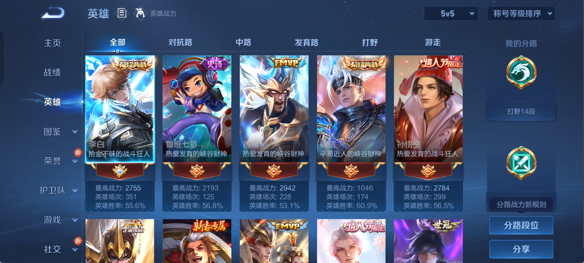 实名: 可修改 性别: 男号 贵族等级: V7 英雄数: 127 皮肤数: 189 荣耀水晶: 鸣剑·曳影,弑枪猎影 传说皮: 黄金狮子座,黄金射手座,久胜战神,一念神魔,云霓雀翎 限定皮: 李小龙,天狼征服者,武陵仙君,大圣娶亲,高山流水,猪悟能,匿光决锋者,唐三藏,五谷丰年,怒海麟威,愿照·山河定,愿照·九州拓 亮点: 【