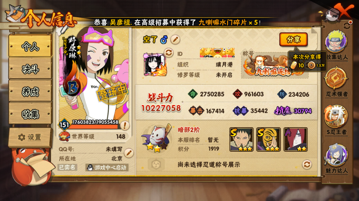 1022w战力白破超38S+5个198直购A+创柱碎片87忍